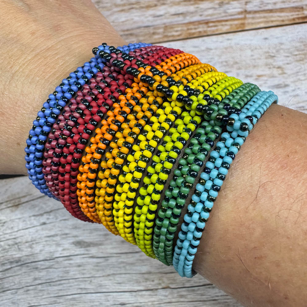 Ein Mehrstrangarmreif, der aus mehreren Strängen doppellagigem MRAW besteht. Die Technik ermöglicht einen robusten und dennoch sehr flexiblen Strang zu arbeiten. Das Armband hat zwei Seiten und man kann es einfach umstülpen und die andere Seite außen tragen. Dadurch ergeben sich schöne Farbvarianten.