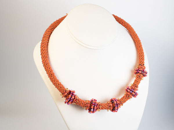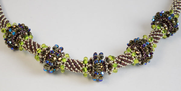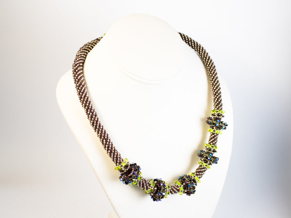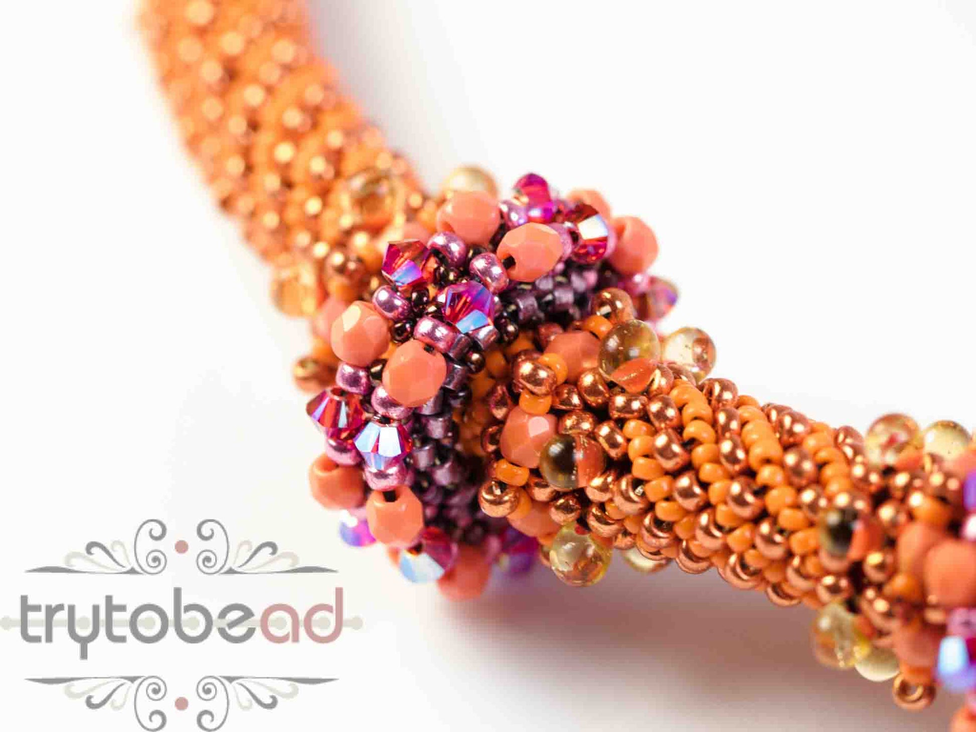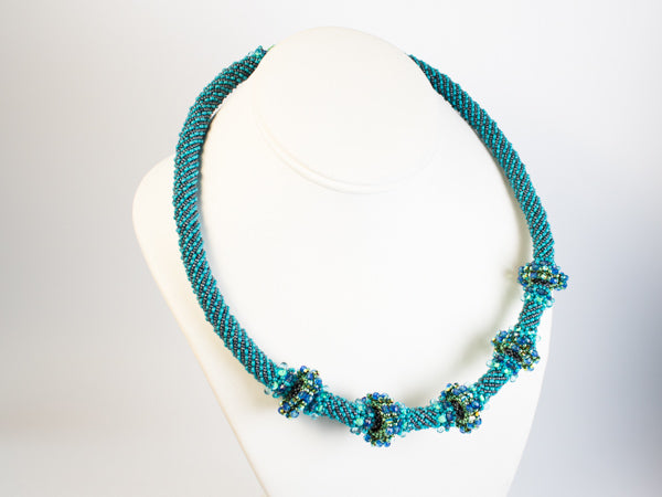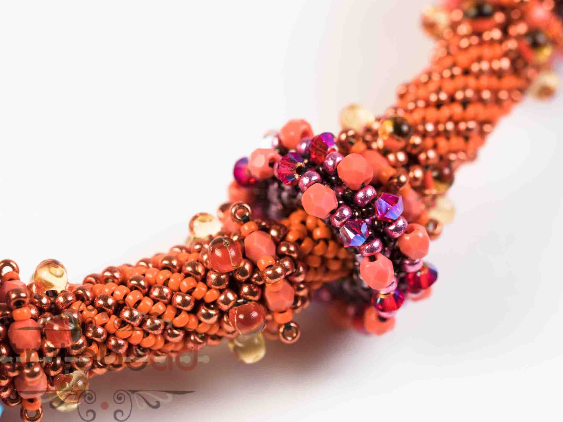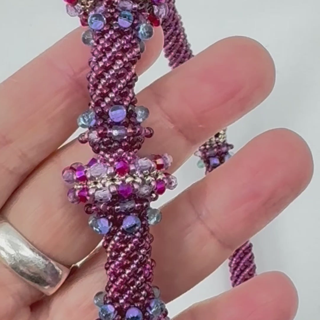 Die perfekte Kette für den Alltag. Der Schlauch wird in Netztechnik gefädelt und dabei kontinuierlich mit Rundperlen gefüllt. Dadurch wird diese eigentlich sehr empfindliche Technik sehr robust. Im vorderen Bereich der Kette haben wir 5 Ringe, die sich um den Schlauch drehen können.