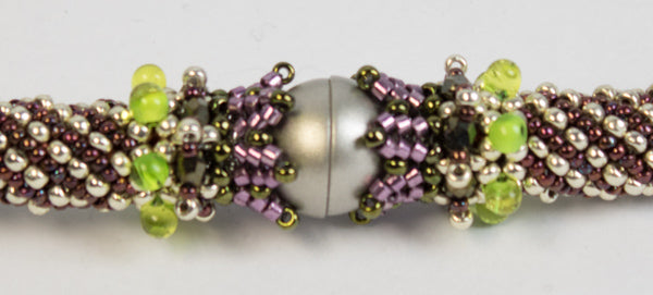 Erforderliches Material: Rundperlen 6mm, Glasschliffperlen 3mm, Bicone 3mm, Miyuki Tropfen 3,4mm, Rocailles Größe 11 und 15, Magnetverschluss.