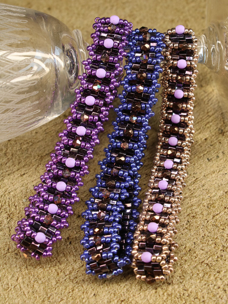 This set of three different bangles is the perfect project to practice Right Angle Weave (RAW) in rounds. The pattern is a renewed variation of the old pattern "Dragons and Roses" that some of you may know. It was completely re- written and contains Video sequences now for additional help.