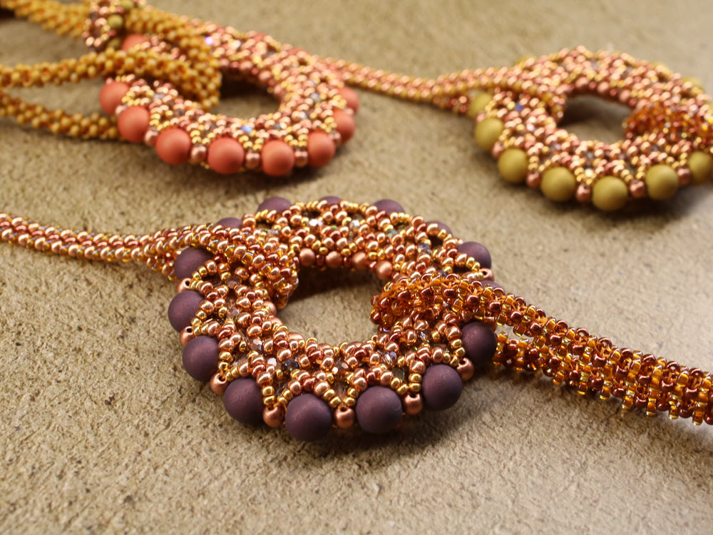 One pattern, three (or more?) variations to assemble. The large rings are made in a one layer RAW construction that gets firm by some easy to make embellishments. Each large ring has a color partner in form of a smaller ring. Chains in prismatic RAW and modified RAW create a light and playful summer necklace. Many tiny rondelles create a discrete sparkle on the rings.