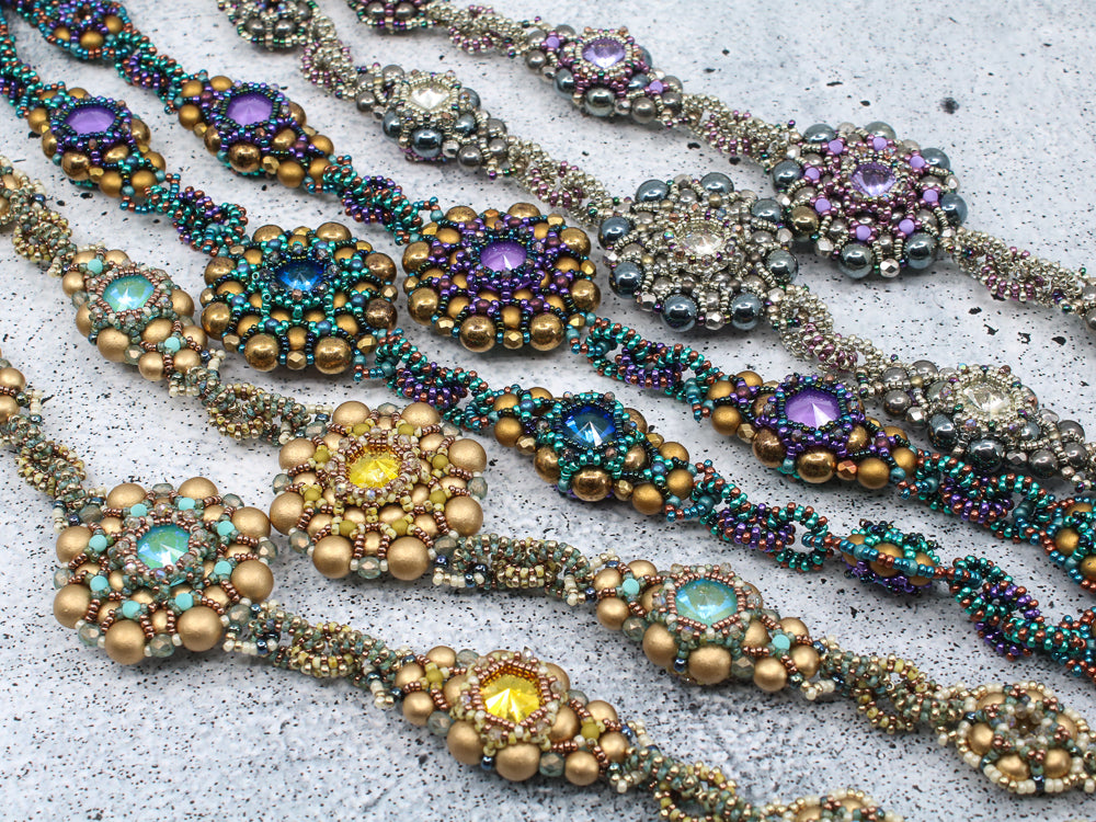 Elbtunnel was taught for the first time in 2020. It is a rich construction of different variations of RAW and CRAW. The finished piece has a very unique flow, just like the waves in a river. The workshop is recommended for experienced beaders.