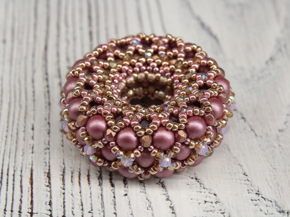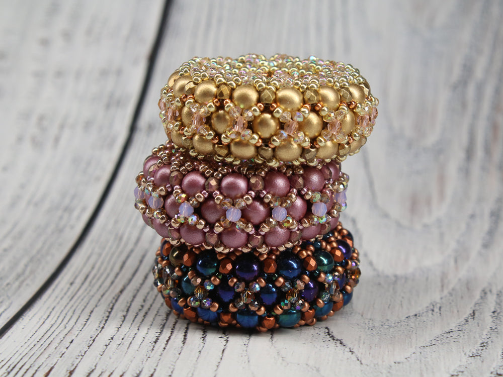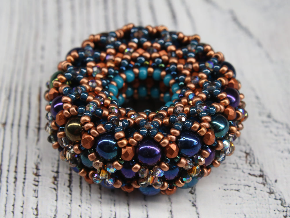 The matching kits for the pattern include all the beads needed for one pendant as shown in the picture. In addition you find the beads for one chain in MRAW technique as shown in the pattern. The chain length is up to 115cm.