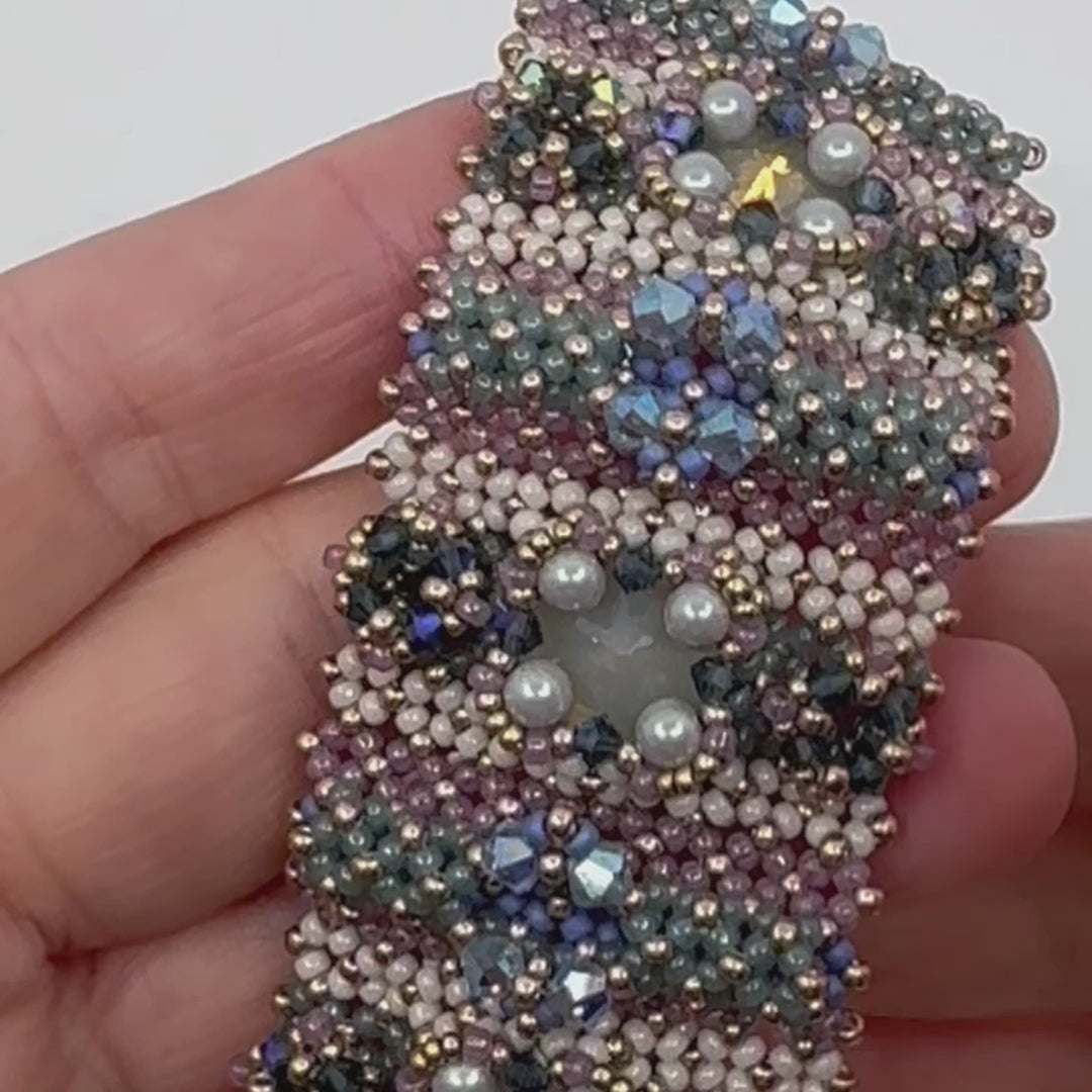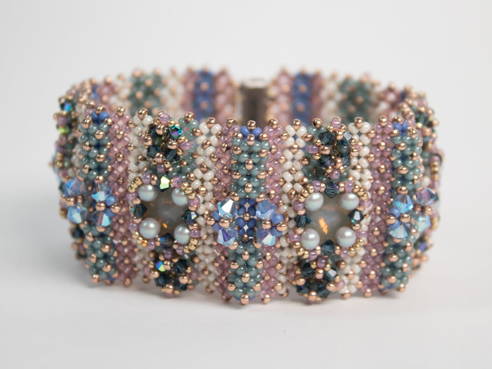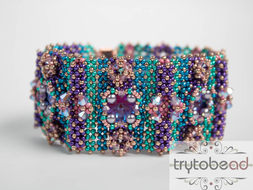 Required supplies: Rivolis 14mm, Bicones 3 and 4mm, Round beads 4mm, Seed beads size 11 and 15, slider clasp 5 loops.