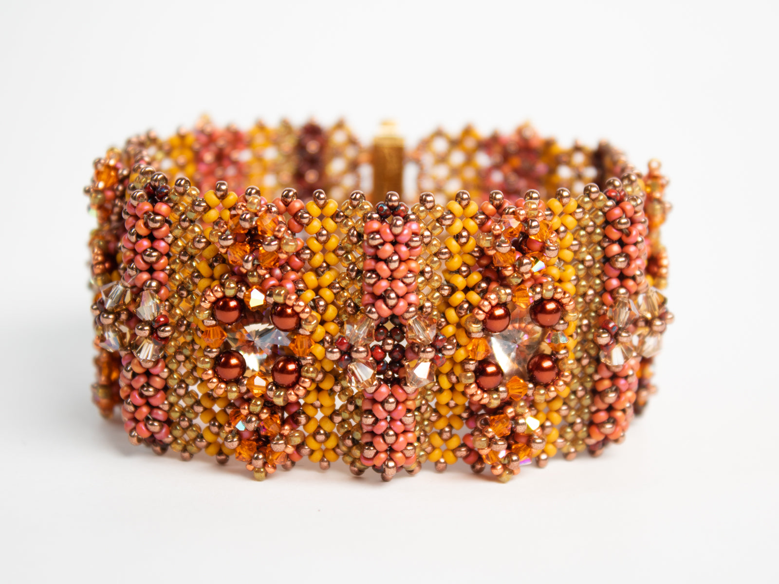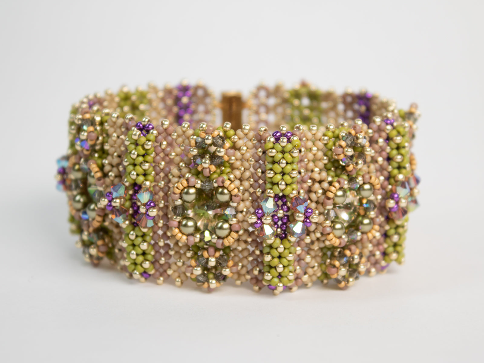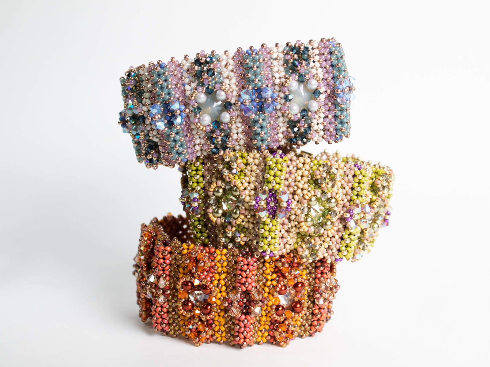 Required supplies: Rivolis 14mm, Bicones 3 and 4mm, Round beads 4mm, Seed beads size 11 and 15, slider clasp 5 loops.