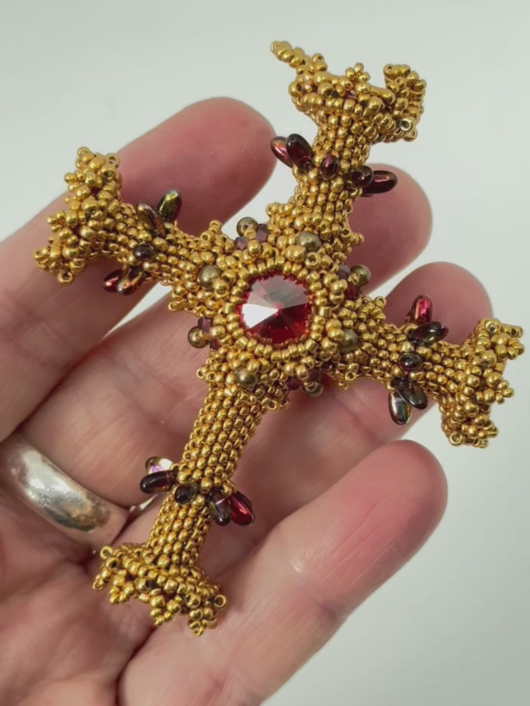 The pattern is based on Peyote technique. You find rivolis in the center (front and back) and on all four ends.