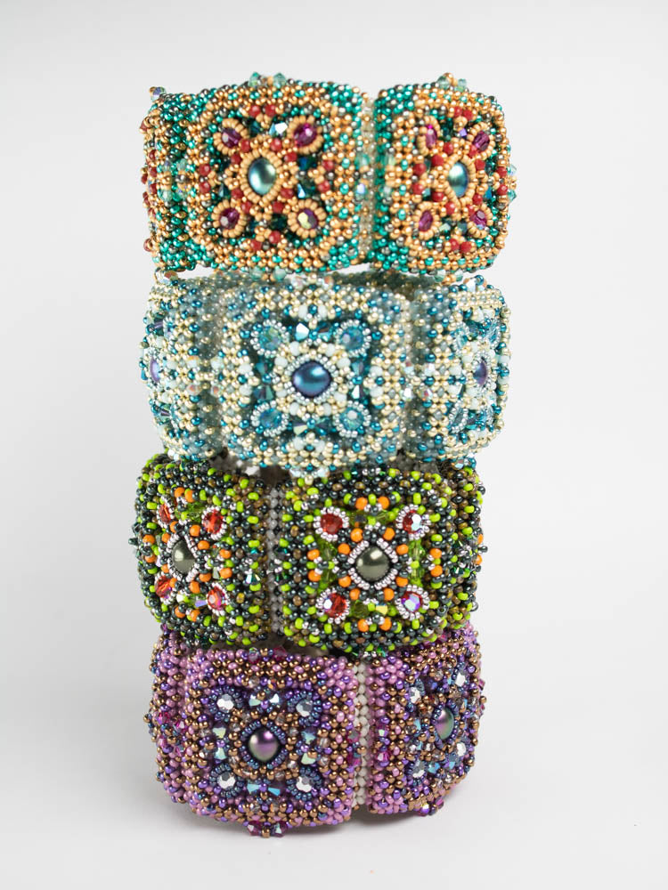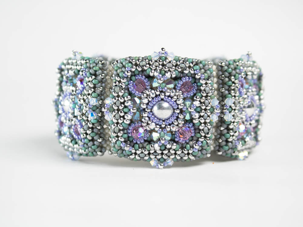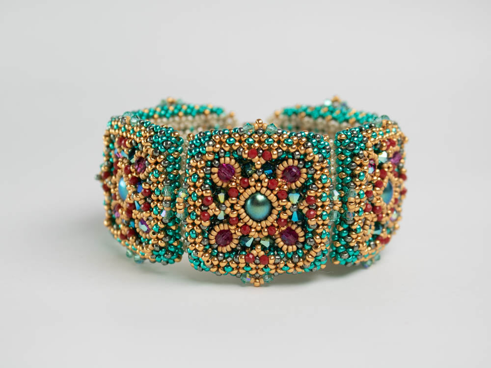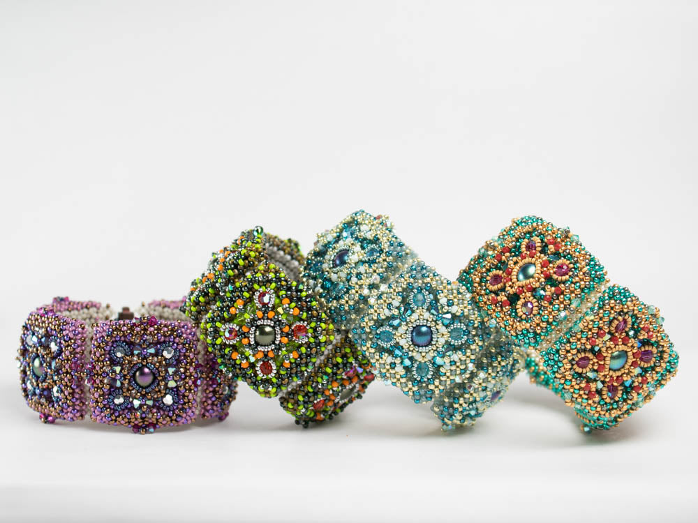 Endless sparkle and beautiful ornaments. Each of the 5 tiles in this bracelet are a piece of art on its own. Double RAW is creating a resistant base for your work.
