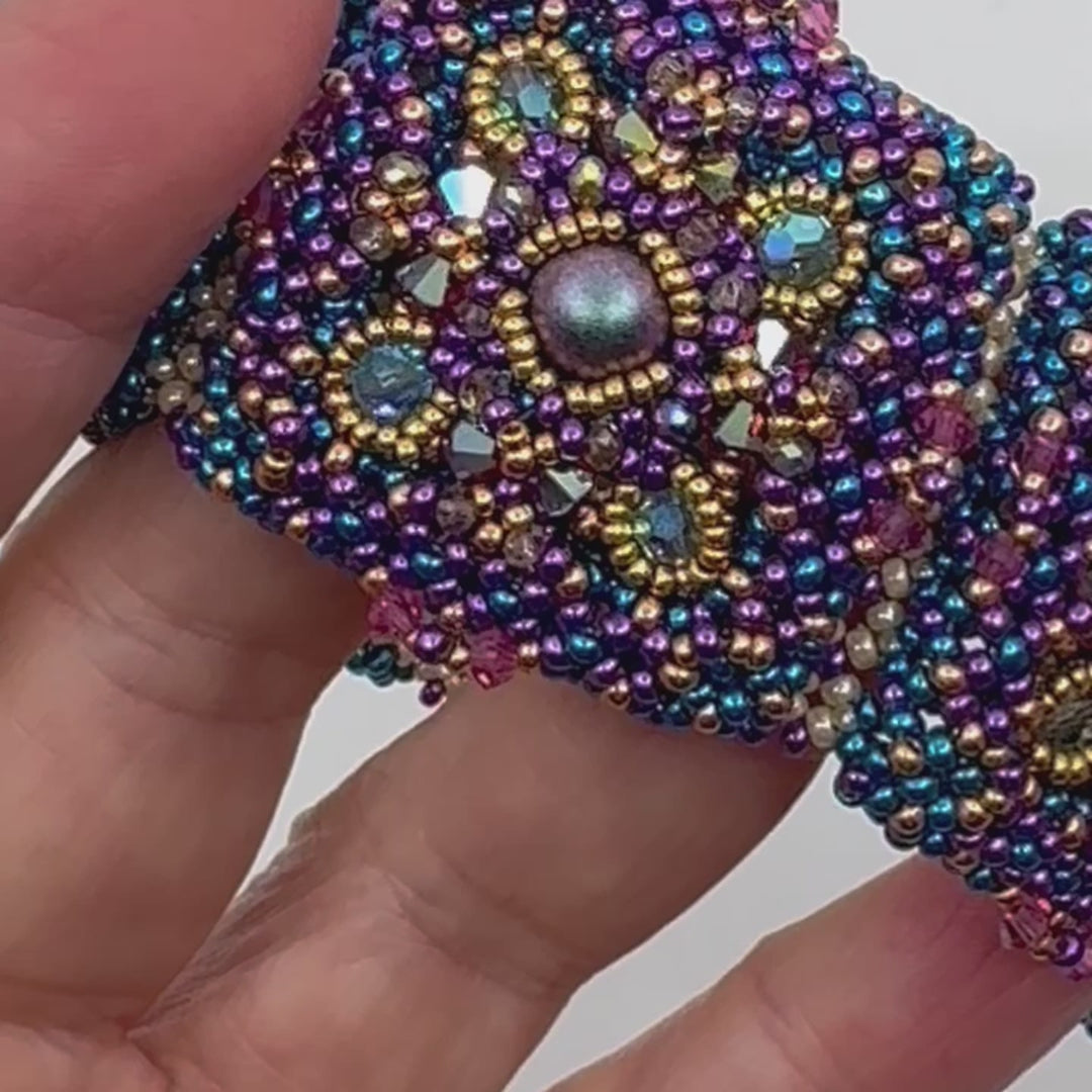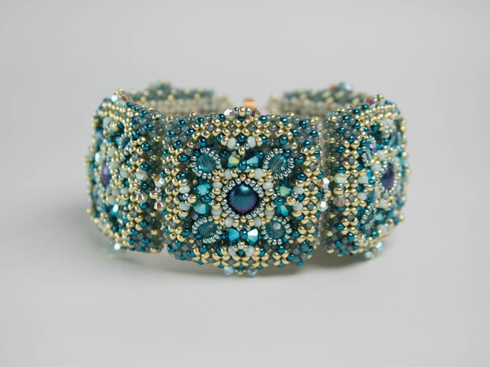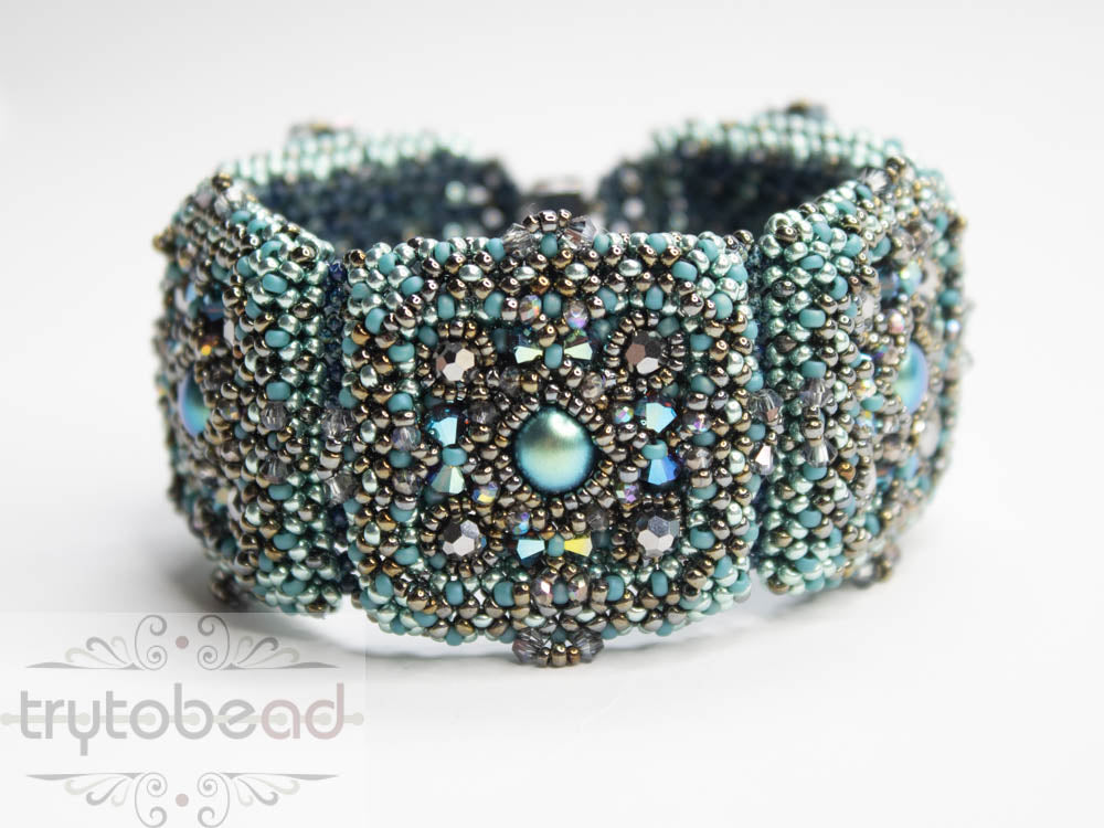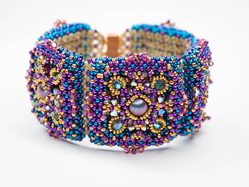 Endless sparkle and beautiful ornaments. Each of the 5 tiles in this bracelet are a piece of art on its own. Double RAW is creating a resistant base for your work.