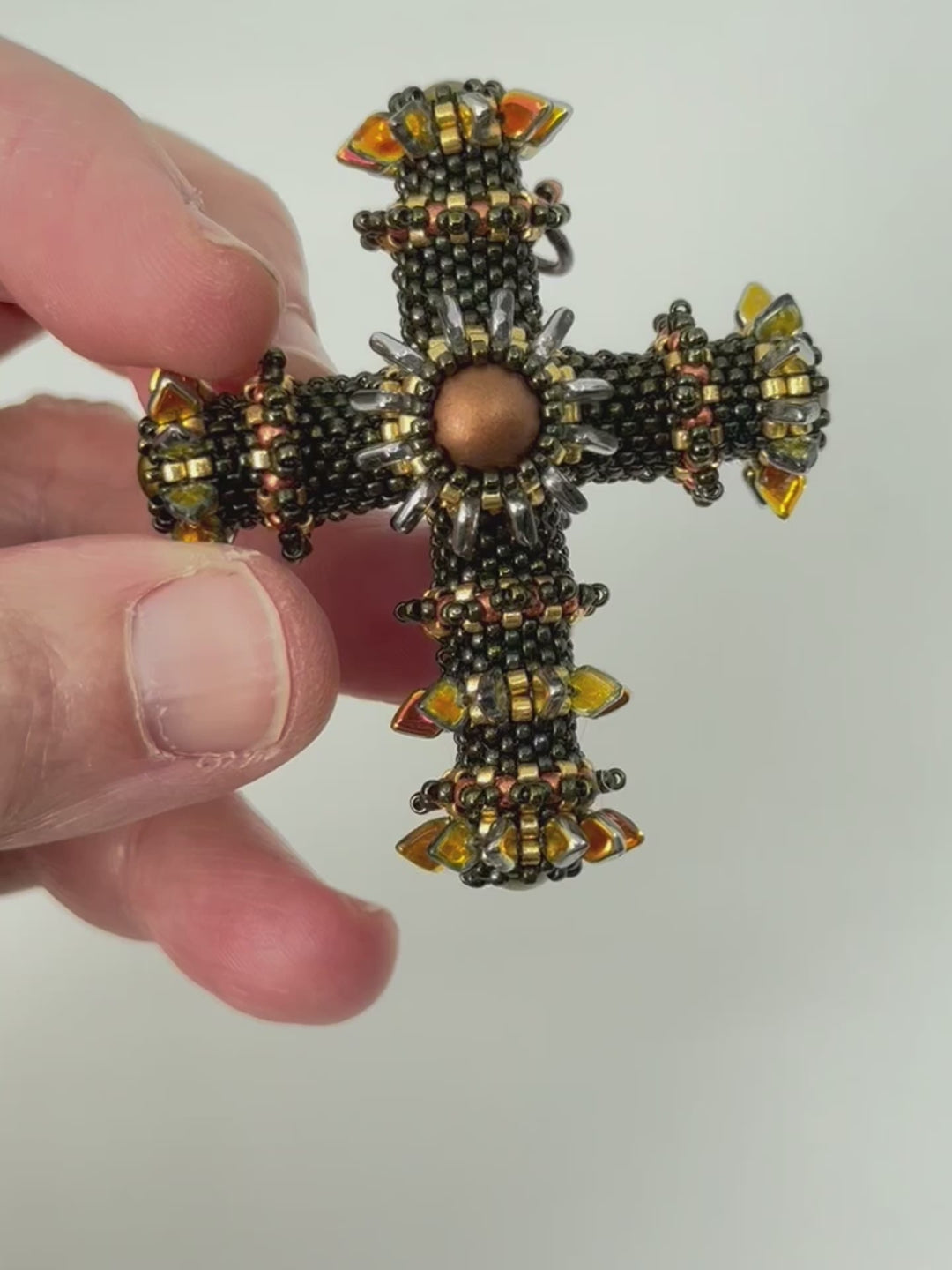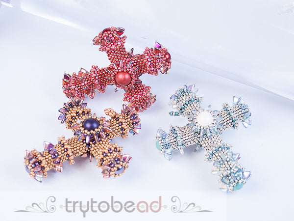 This Peyote based cross is a bit smaller than the other ones and measures about 6x5cm. It is a bit more simple as we have round beads in the center and on the ends.