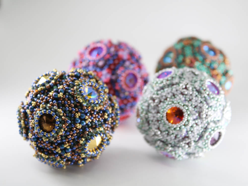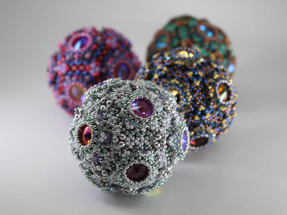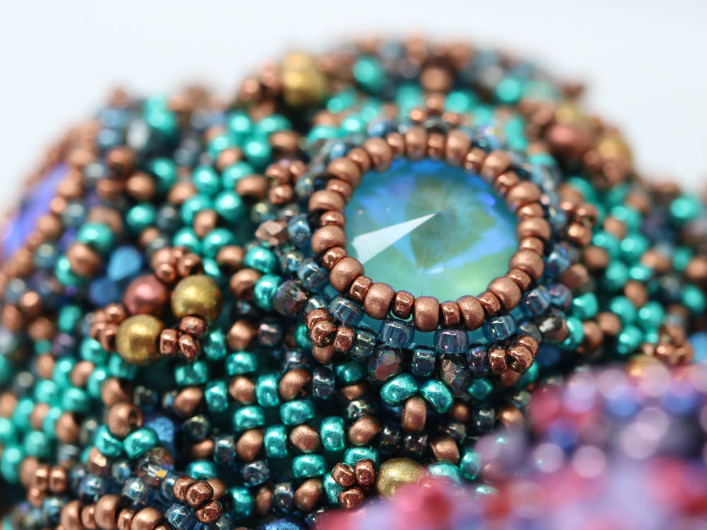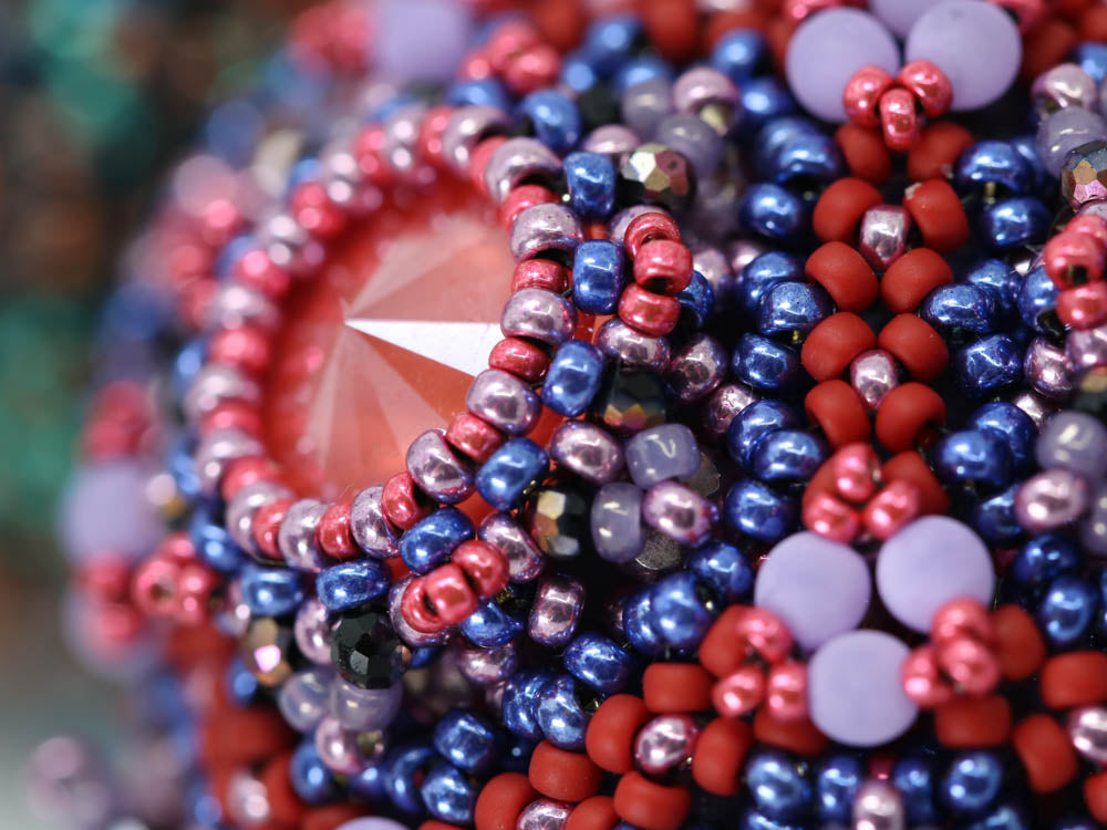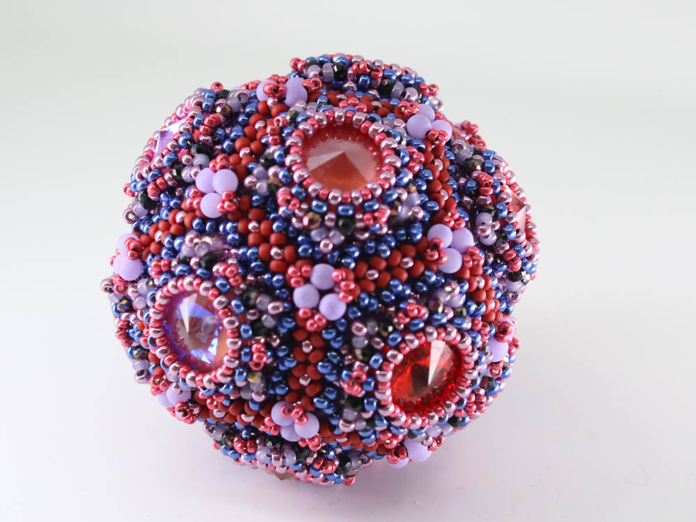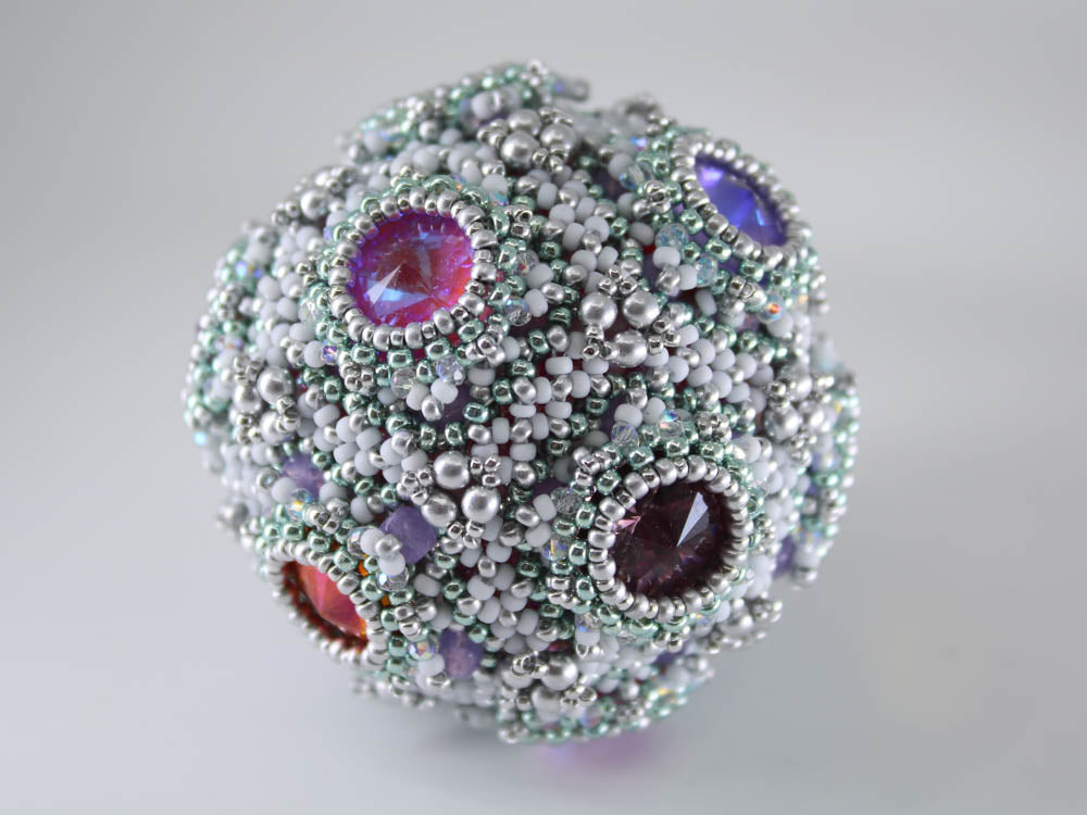 Everglow is a sphere of about 6cm diameter. 12 Rivolis in 12 different colors are the main focus in this piece. The structure made in Double RAW technique is super sturdy and resistant. The project is worked in layers and less complicated than you may expect. Basic knowledge in RAW technique is required.