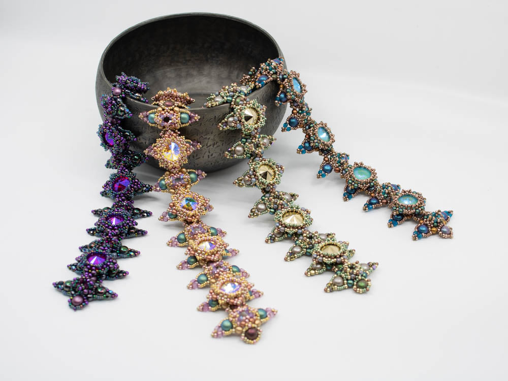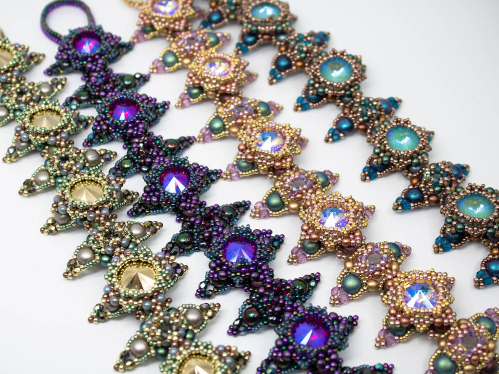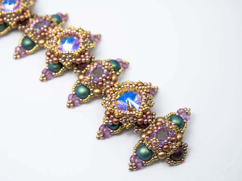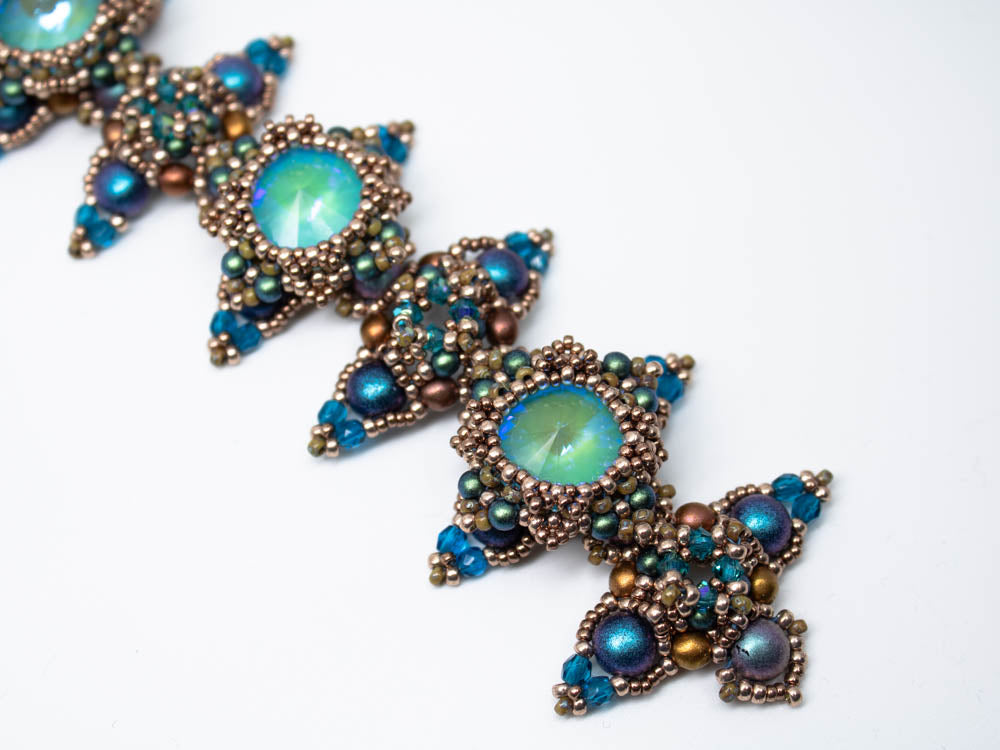 Required supplies: Rivolis 14mm, 2 hole cabochons 6mm, round beads 3mm and 4mm, Bicones and firepolished beads 3mm, seed beads size 11 and 15.