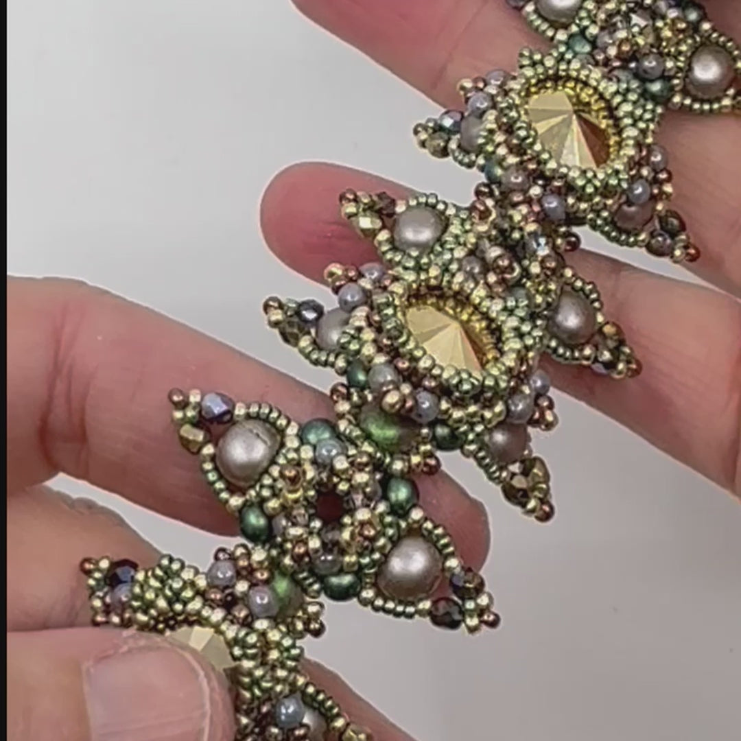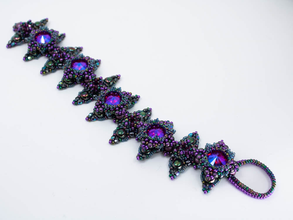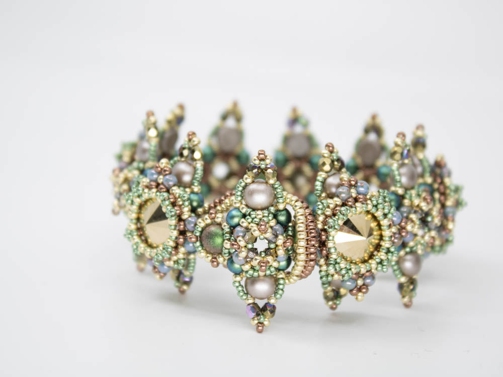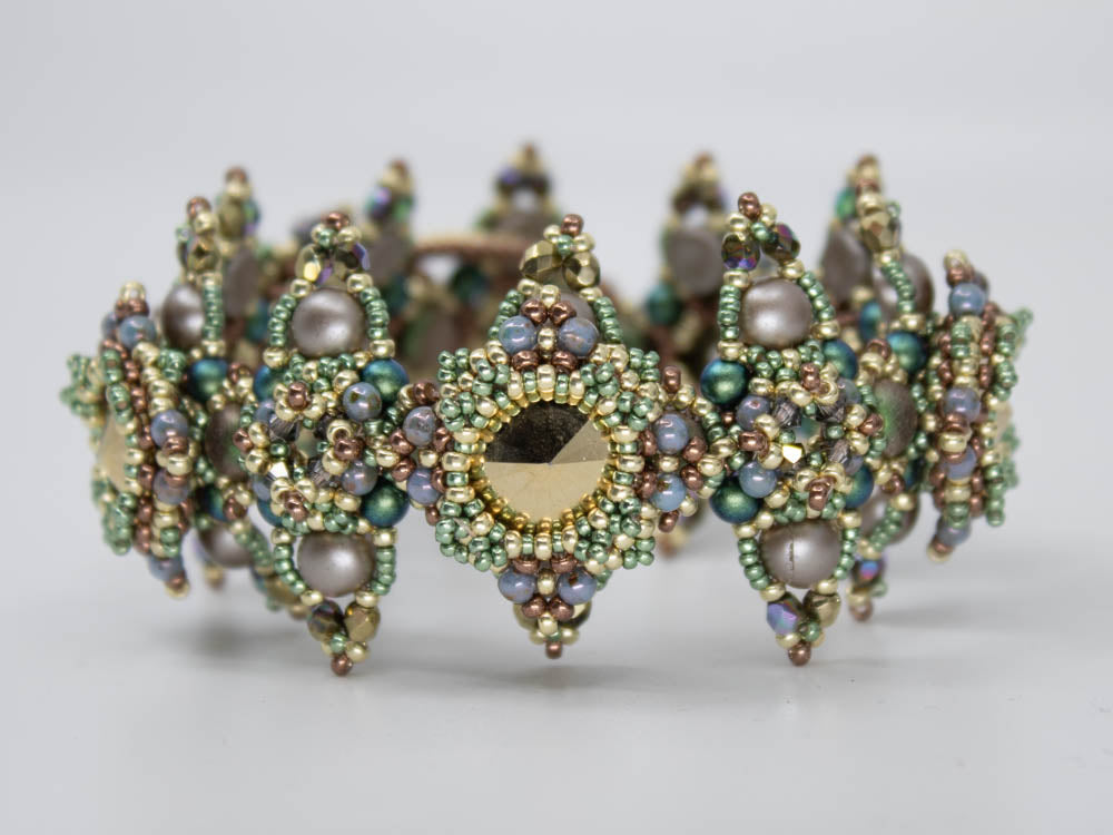 Required supplies: Rivolis 14mm, 2 hole cabochons 6mm, round beads 3mm and 4mm, Bicones and firepolished beads 3mm, seed beads size 11 and 15.