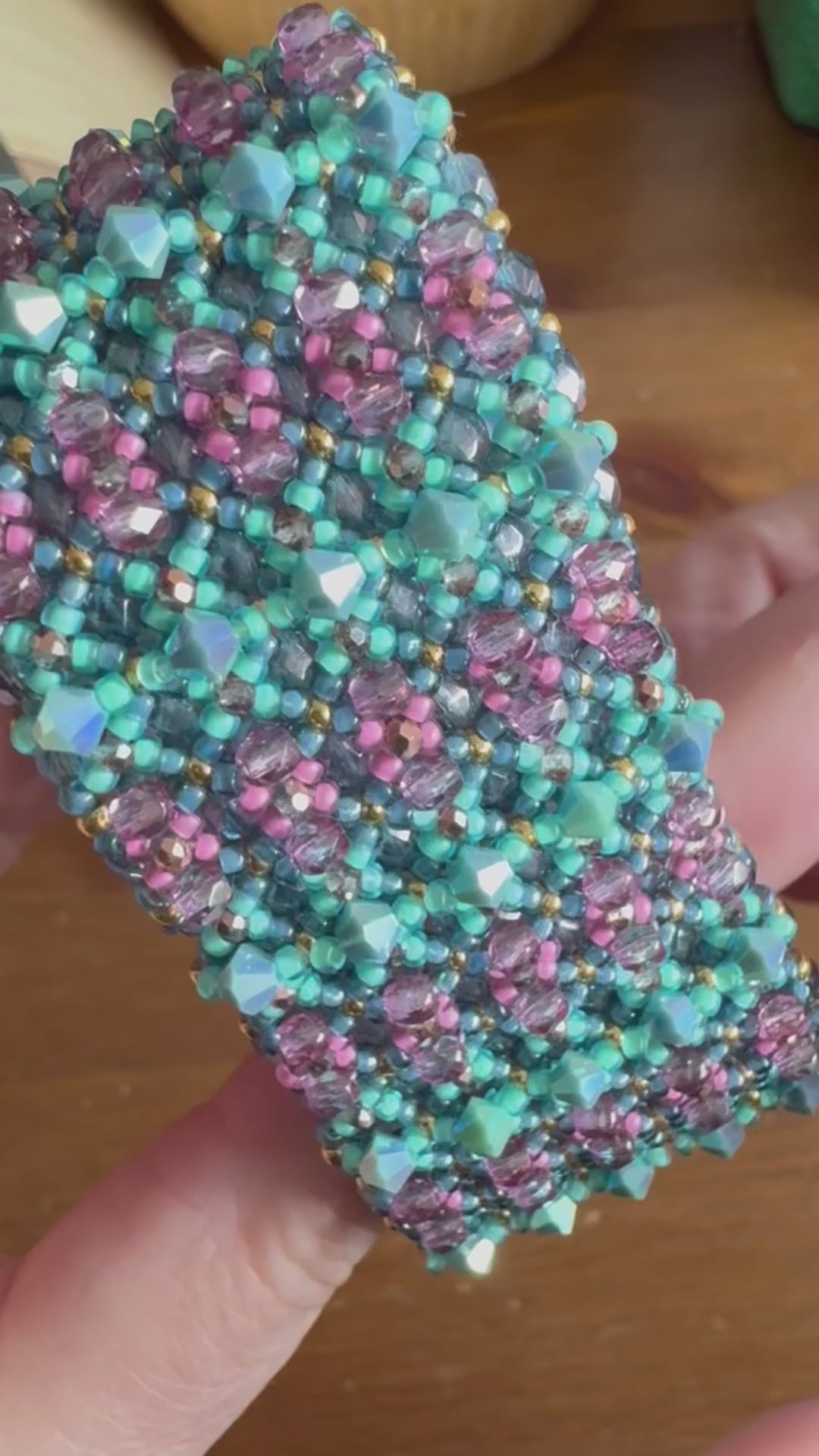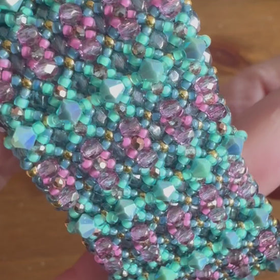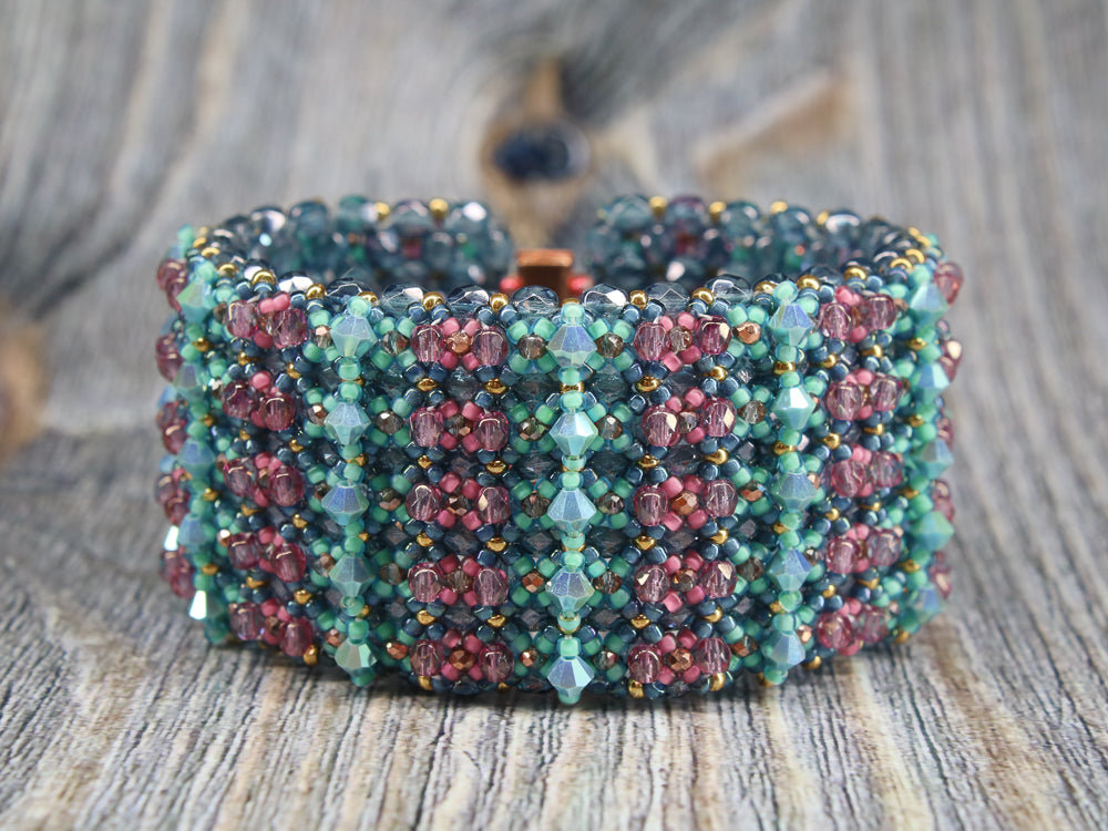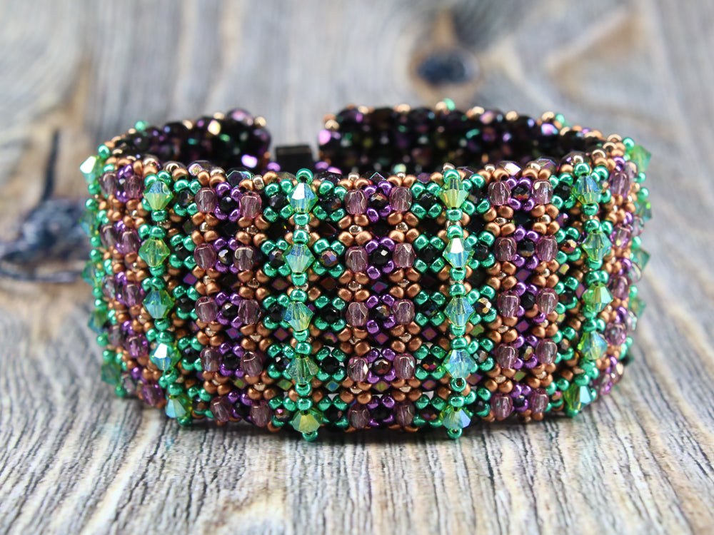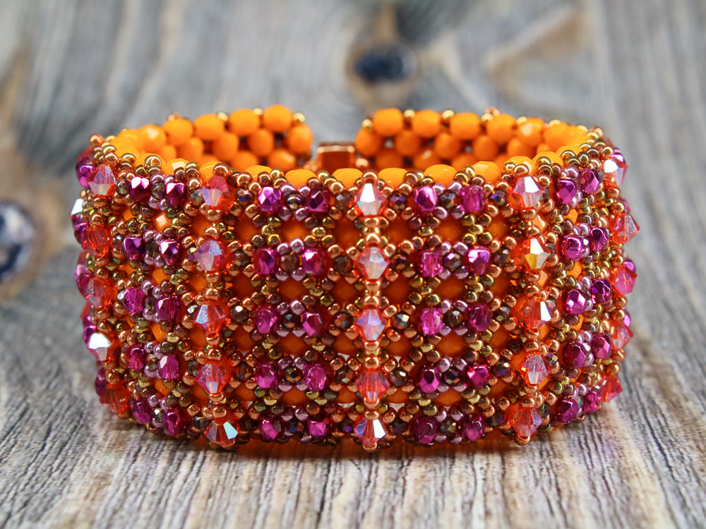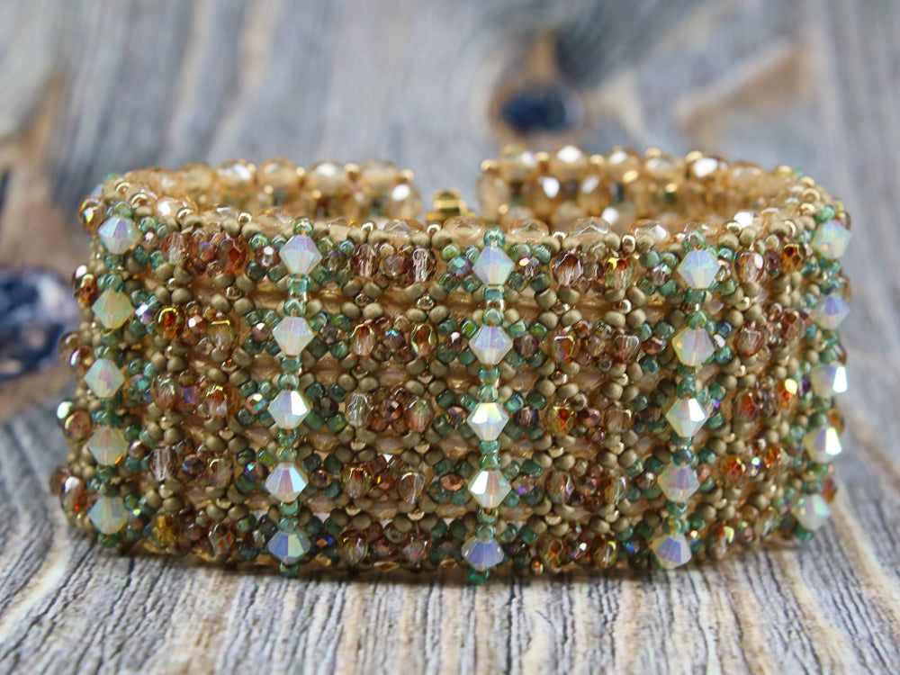 This bracelet is based on a right angle weave grid of 4mm firepolished beads. It is not too time consuming and you can quickly hold this sparkling beauty in your hands.