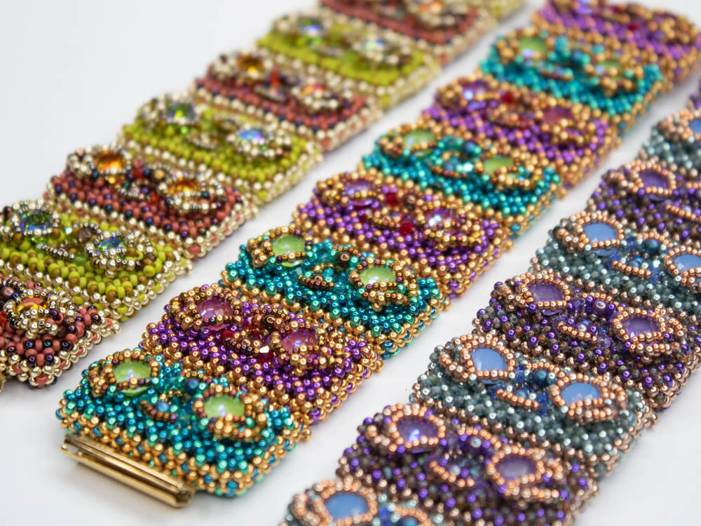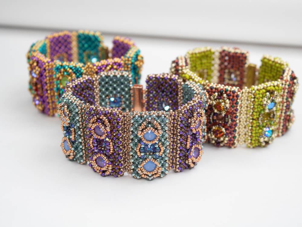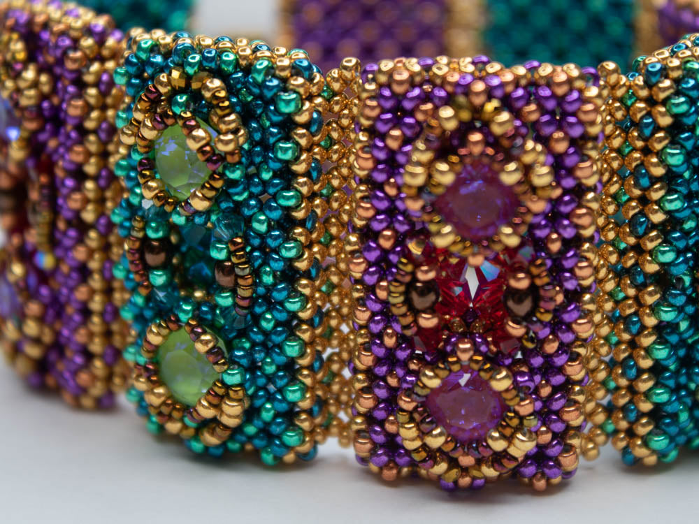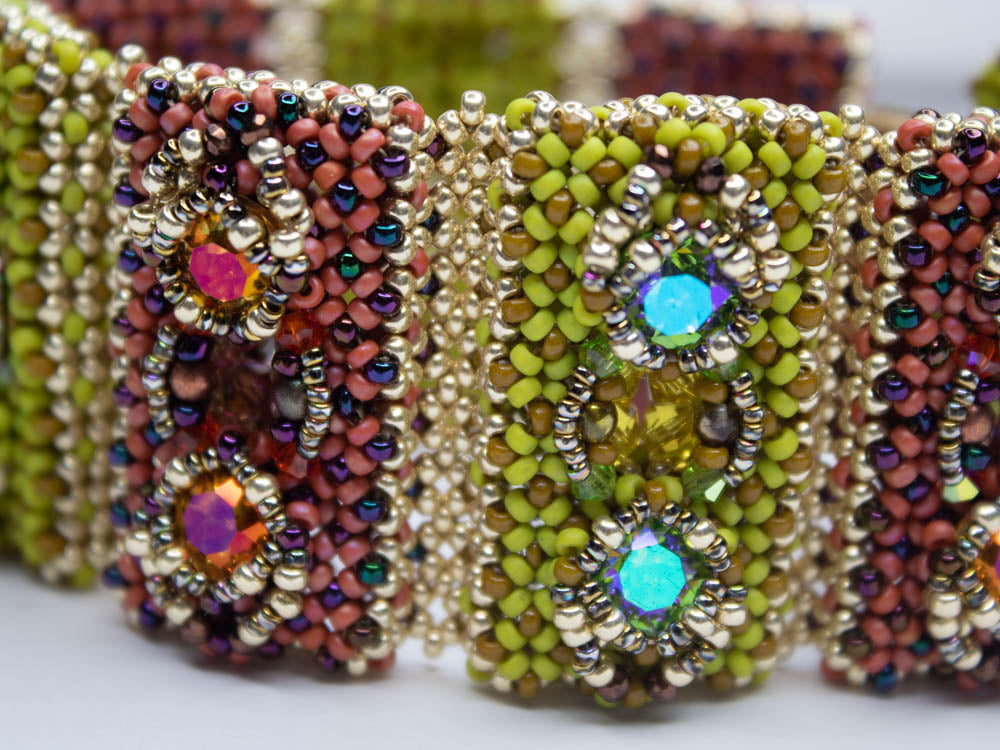 This bracelet is a real treasure. Two alternating color sections with lots of sparkling crystals create a real eye catcher. The structure is easy to make. All stitches are done in rows or rounds, no complicated 3D techniques are required.