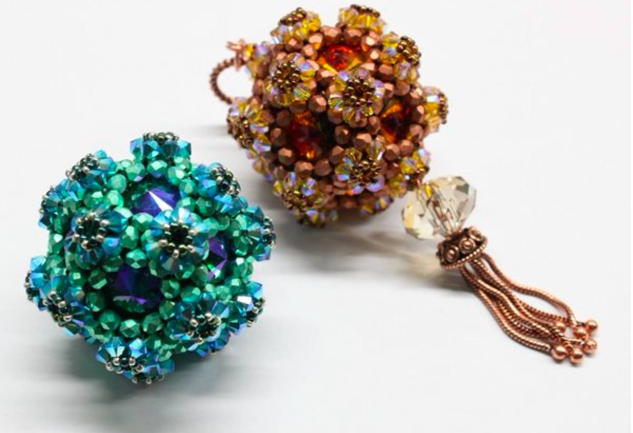 This piece is another dodecahedron with bezeled rivolis and gets embellished with many sparkling crystals. It has a diameter of about 7.5cm. The pattern includes 13 pages with many pictures and illustrations.