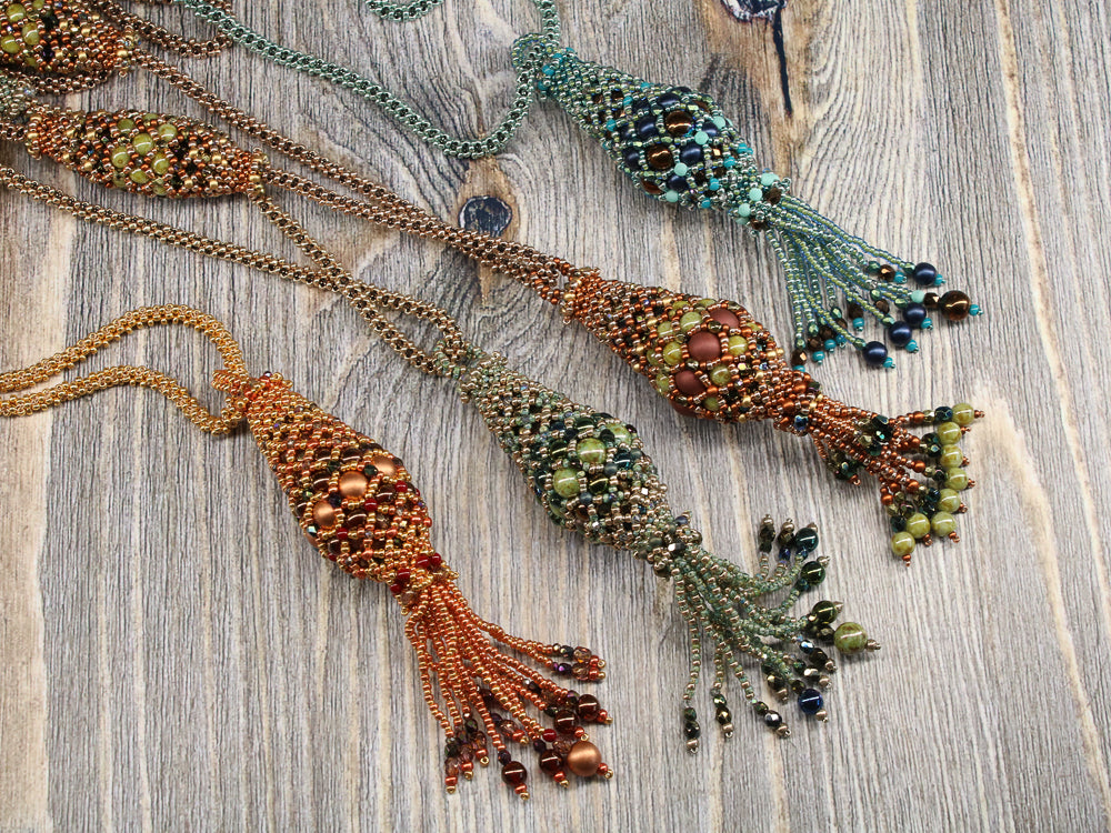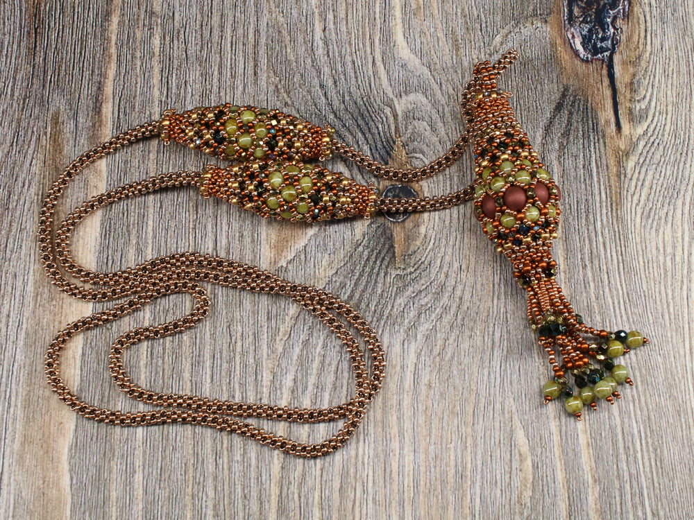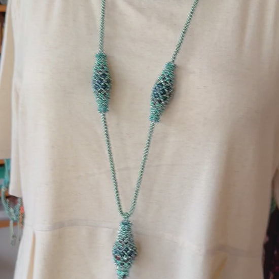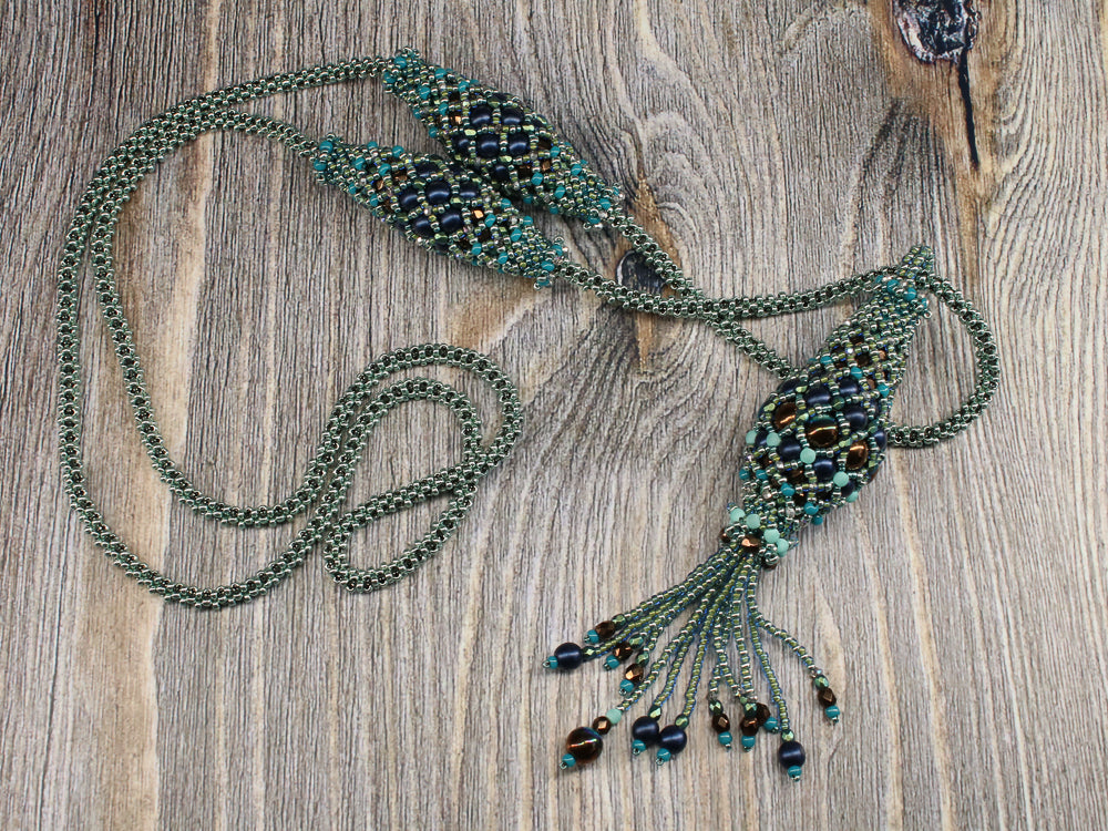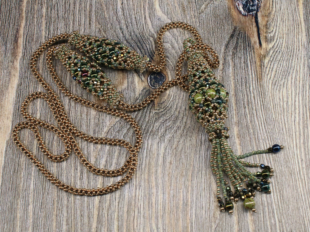 In the Air Tonight is an elegant long necklace with a simple rope in PRAW technique. The pendant and the olives are self supporting structures and do not require any filling.