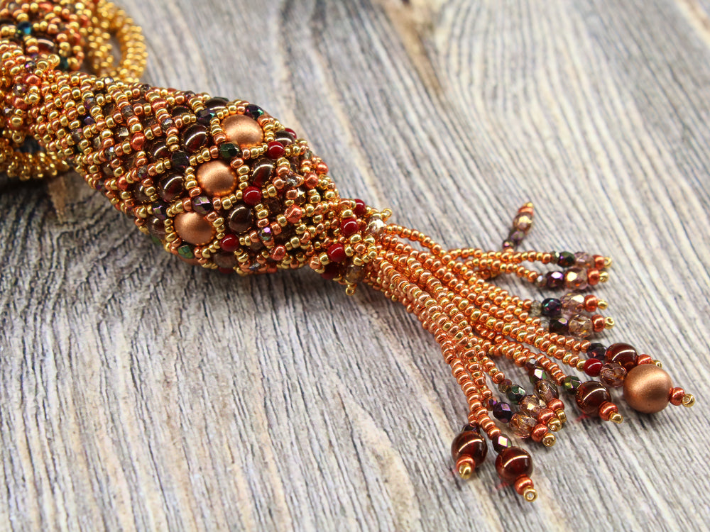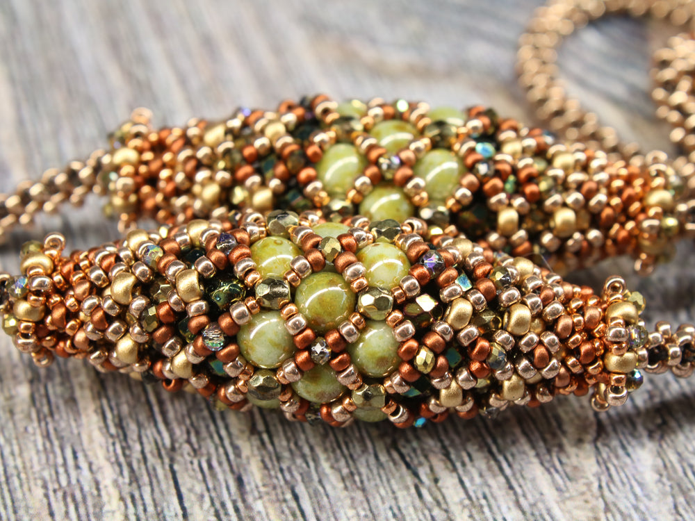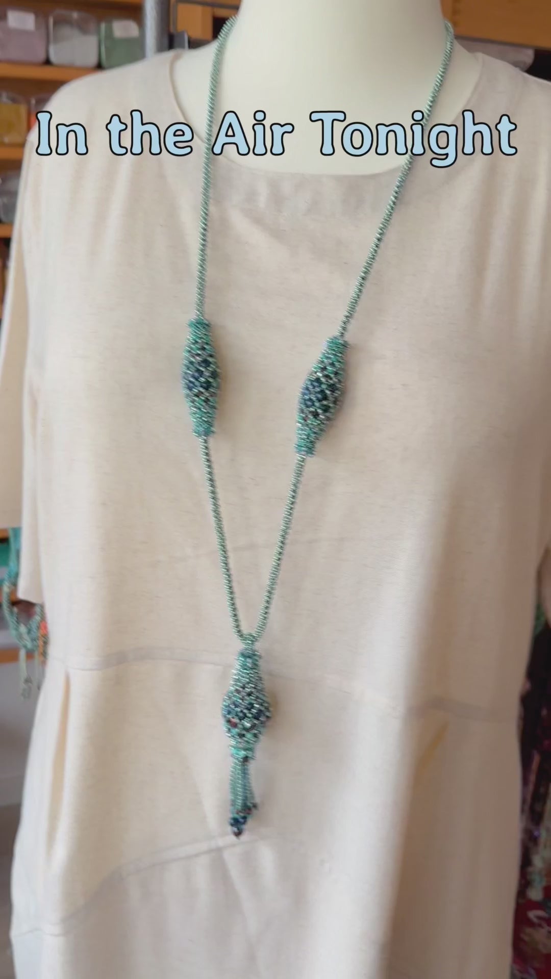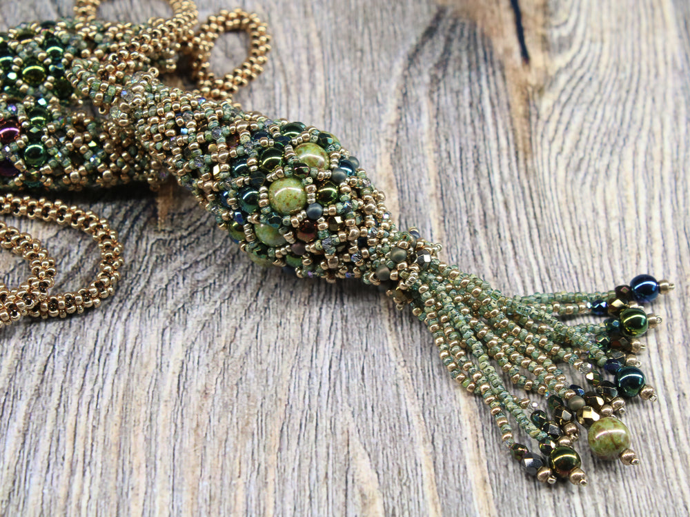 In the Air Tonight is an elegant long necklace with a simple rope in PRAW technique. The pendant and the olives are self supporting structures and do not require any filling.