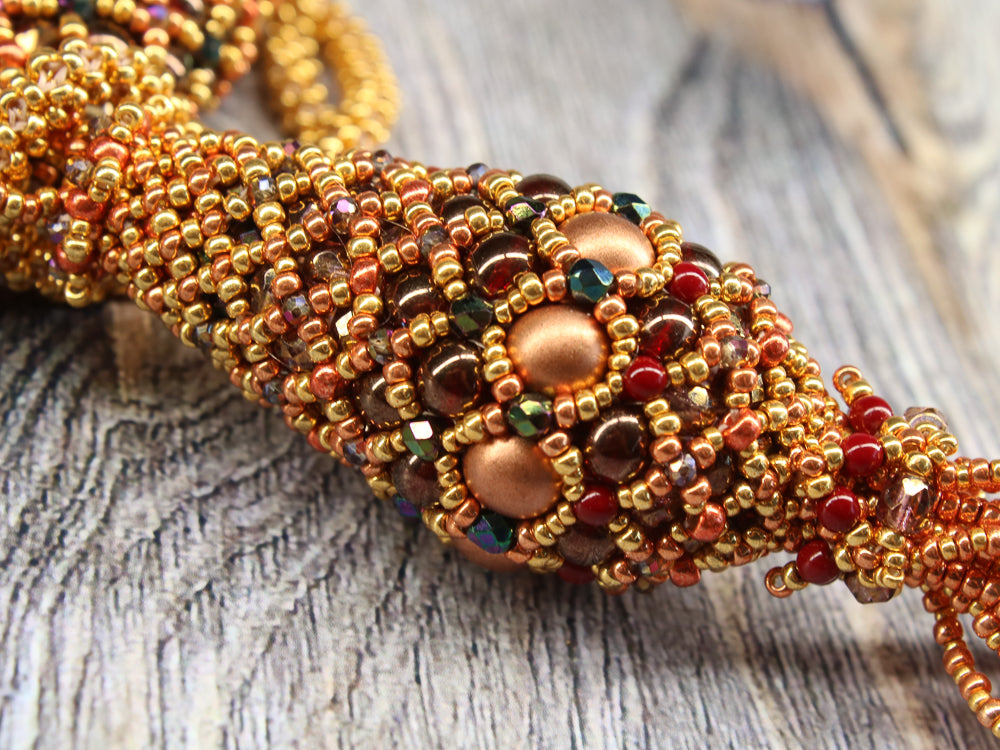 Required supplies: Round beads (8mm, 6mm, 3mm), firepolished beads (4mm, 3mm), Rondelles 1.5 to 2mm, seed beads size 8, 11 and 15.