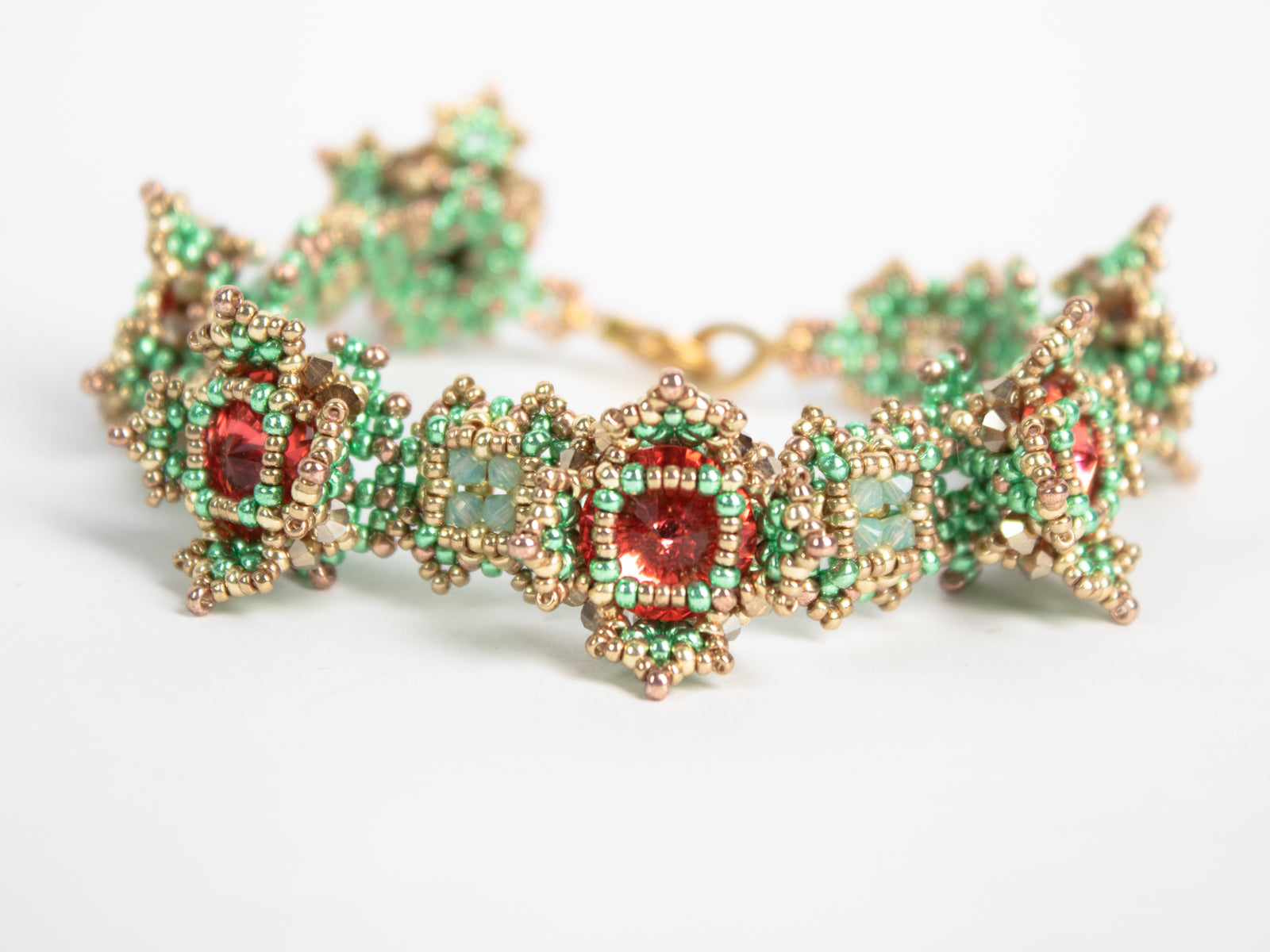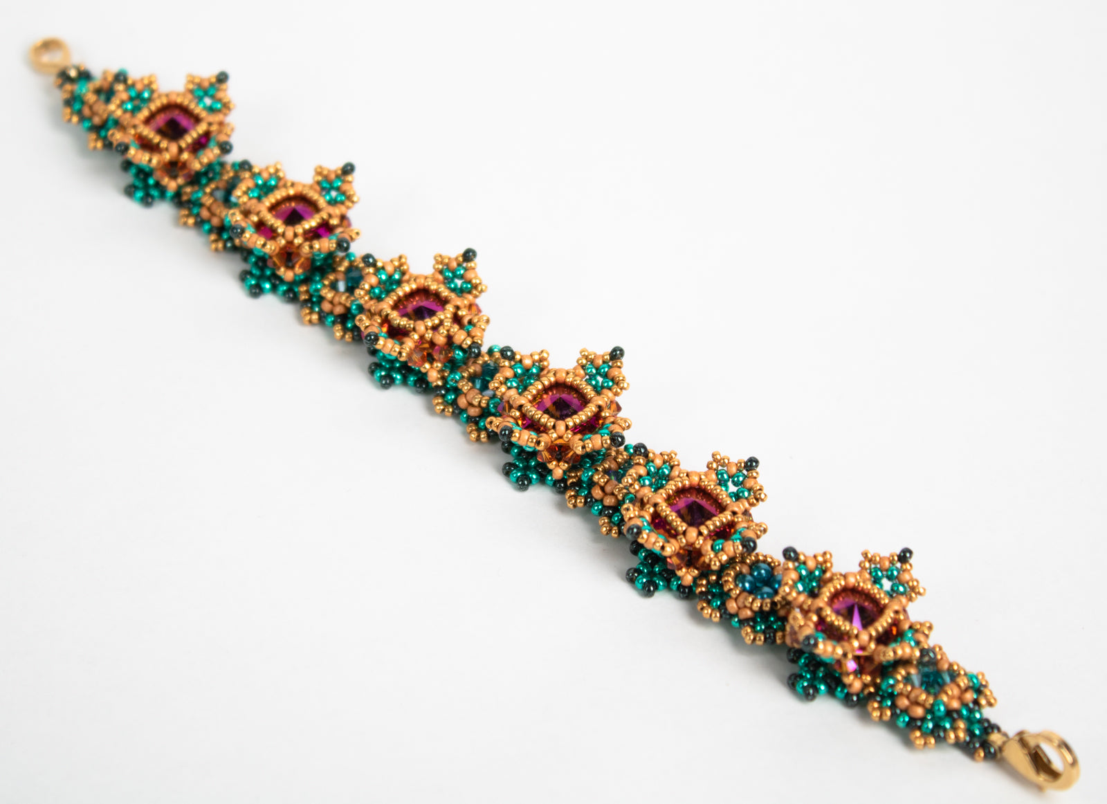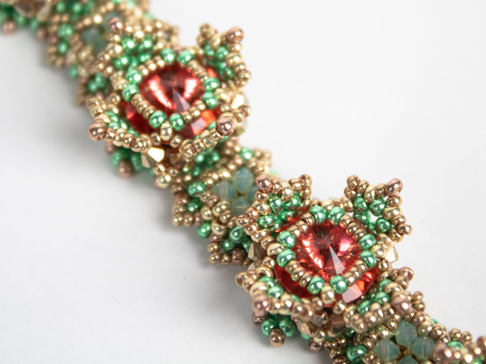 Rivolis in a flower shaped bezel and in between them even more sparkling components. The bracelet is also suitable for less experienced beaders and due to it's smaller size it is also perfect for every day.