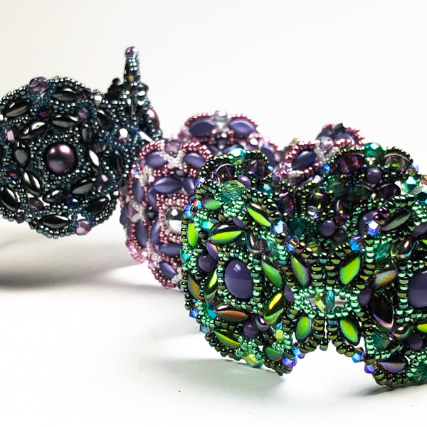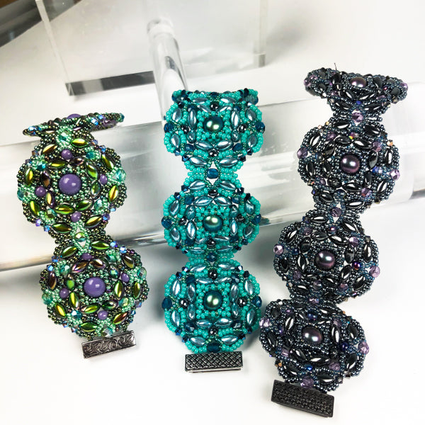 Required supplies: Round beads 8mm and 4mm, firepolished beads 4mm, Irisduo beads, bicones 3mm, seed beads size 11 and 15, sliding clasp 3 loops.