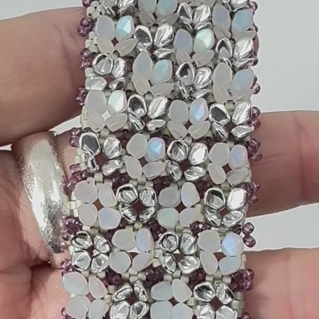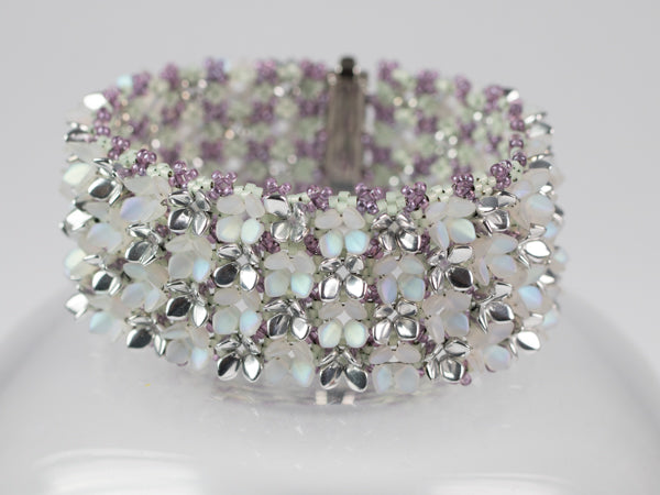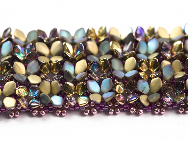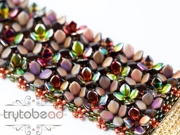 Many little Gekko beads are arranged like a meadow full of flowers. The pattern is suitable for less experienced beaders and a lot of fun to make and wear.