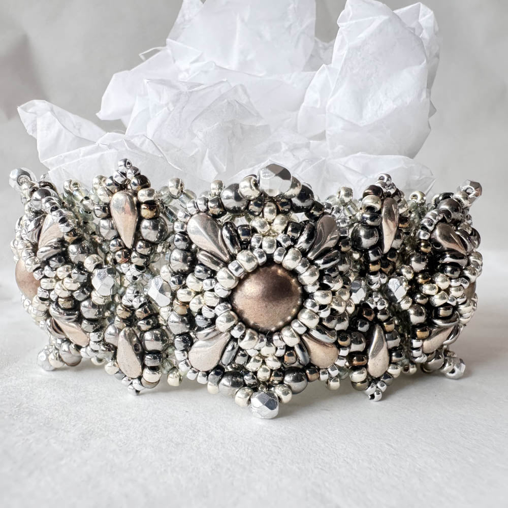 In this beautiful ornamental design you will find some little tricks, that make this piece not only very wearable, but also quite resistant. The clasp is a button in the exact same pattern as the single sections of the bracelet.