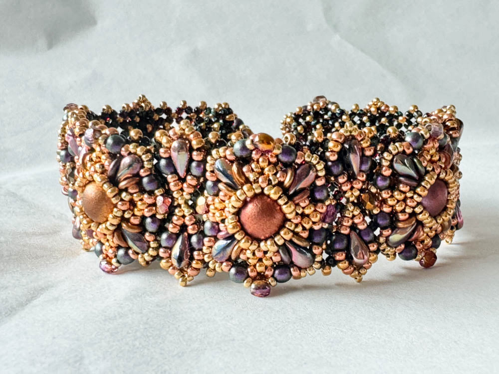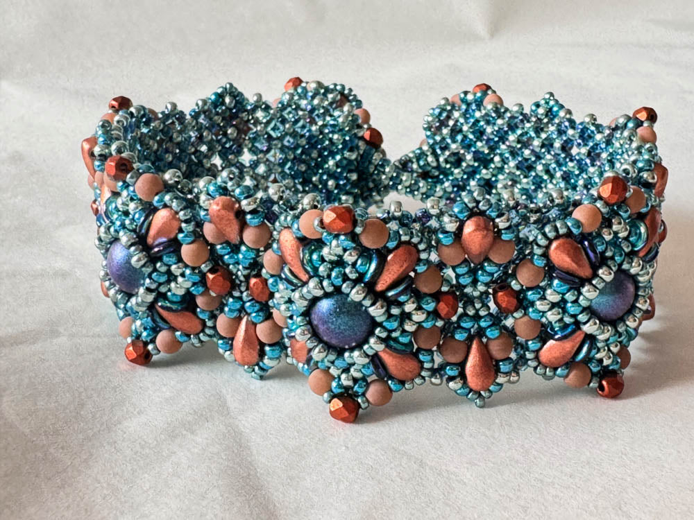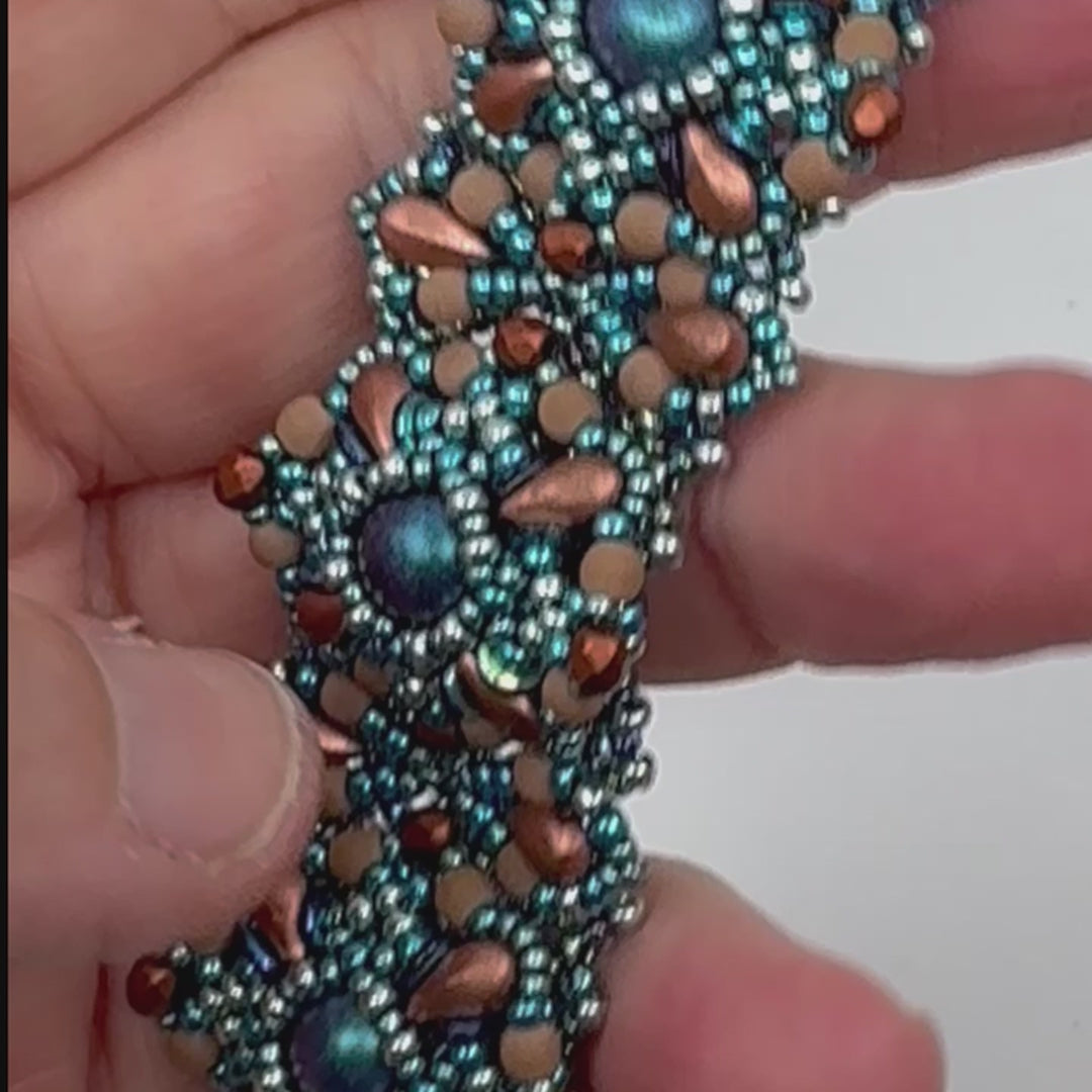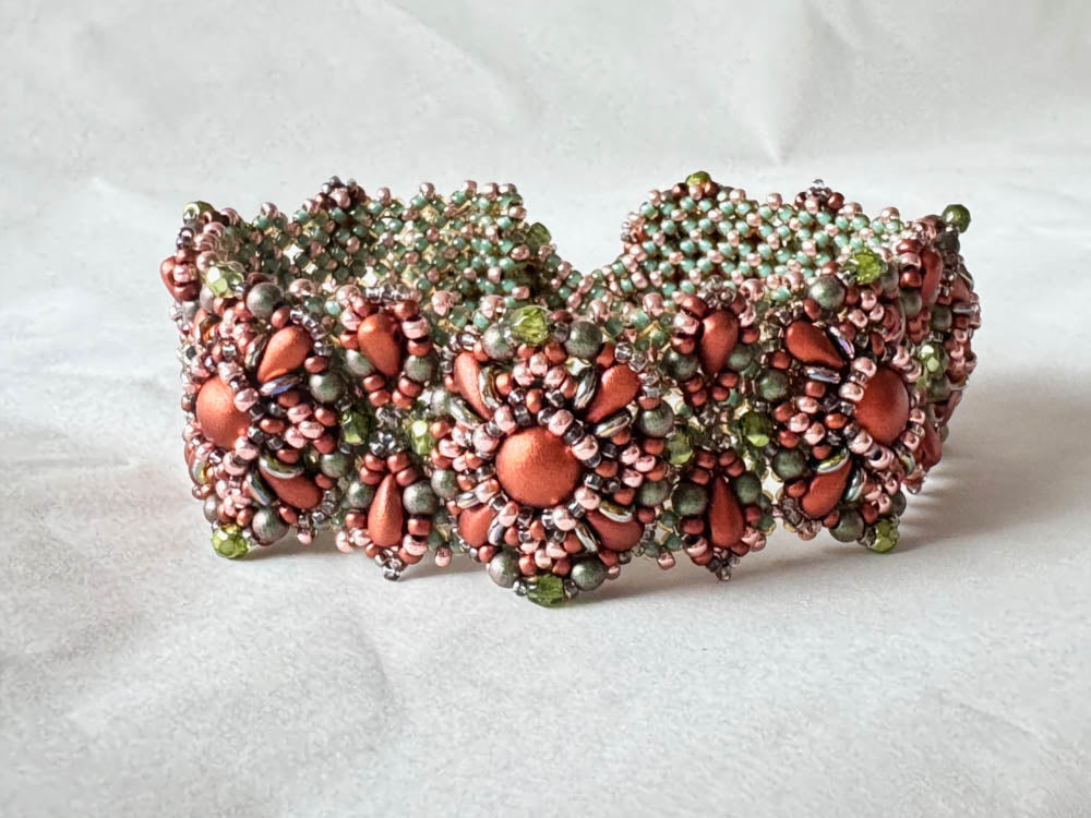 Required supplies: Round beads 8mm, DropDuos (TM), O Beads (TM), round beads 3mm, firepolished beads 3mm, seed beads size 11 and 15.