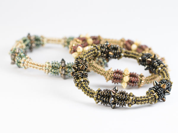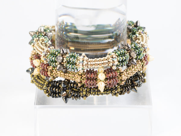 This bangle can be rolled over your wrist. It has a more powerful look due to the spiky buttons next to the pillows made from O Beads.