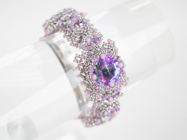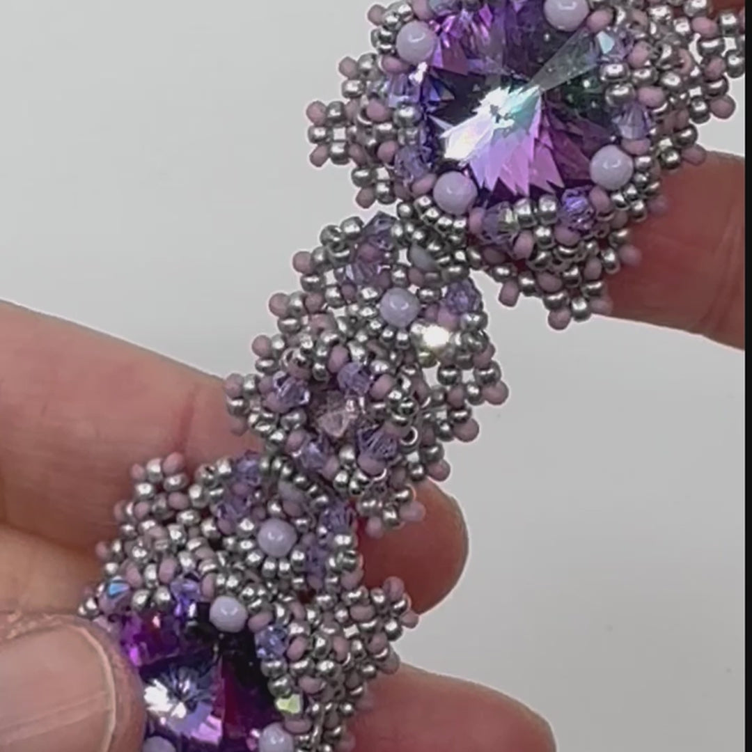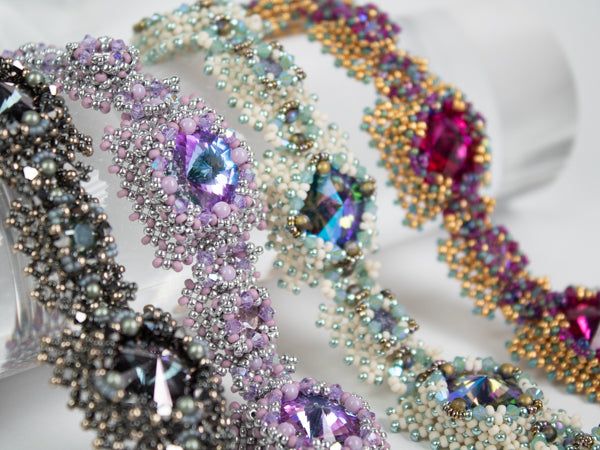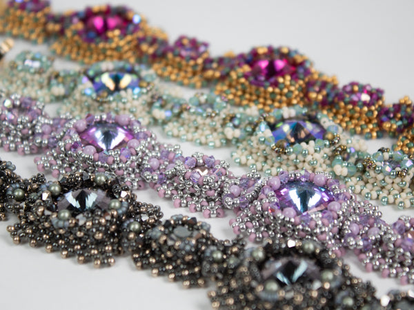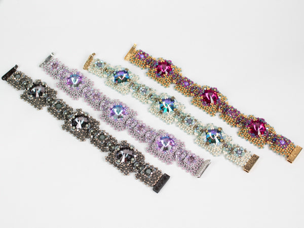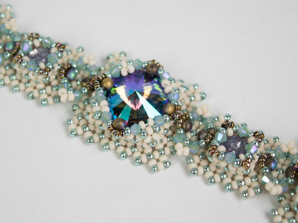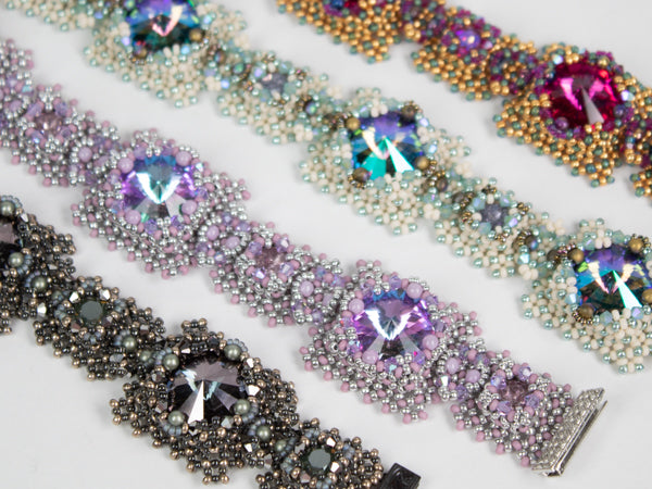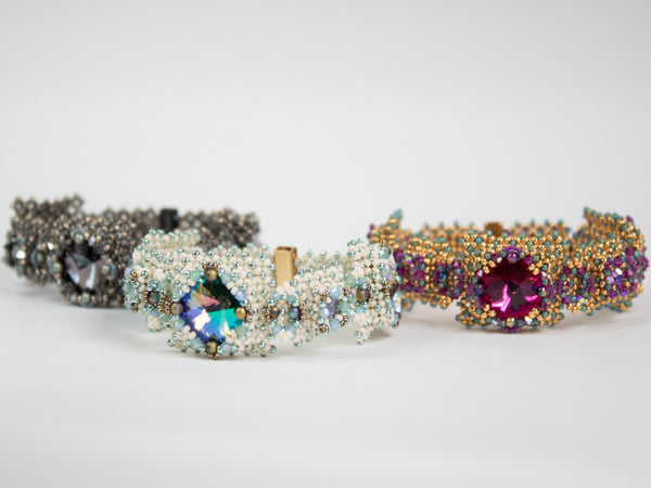 Required Supplies: Rivolis 18mm, Chatons 8mm, Bicones 3mm, round beads 3mm, seed beads size 11 and 15, slider clasp 3 loops.