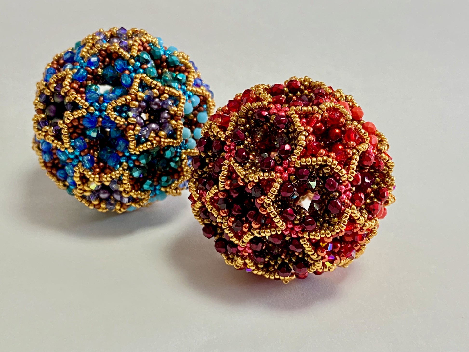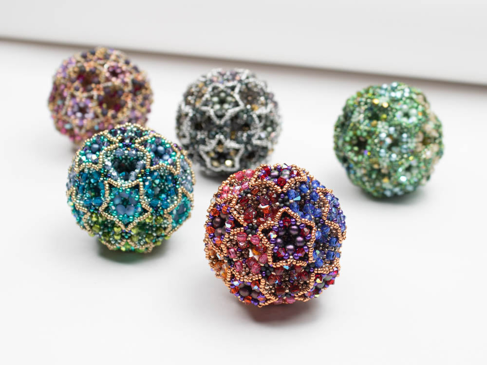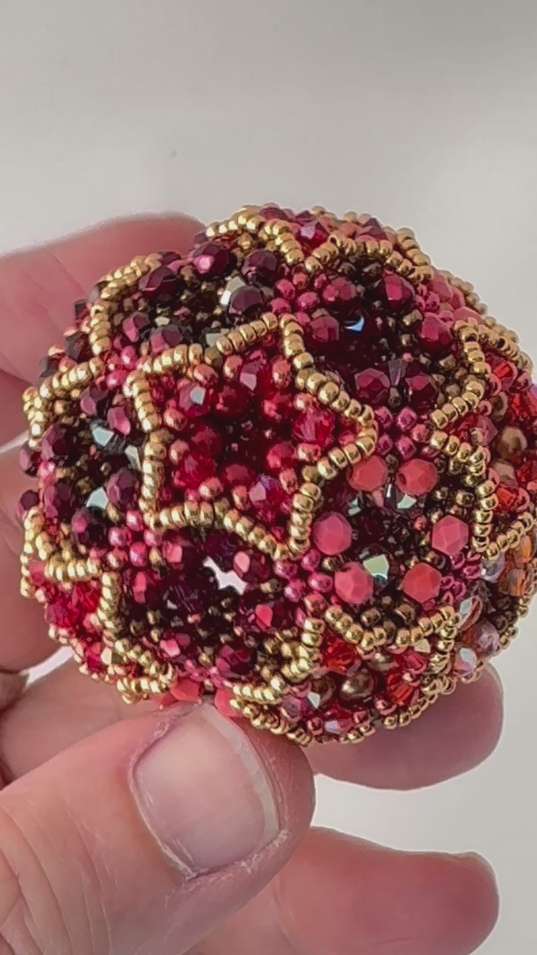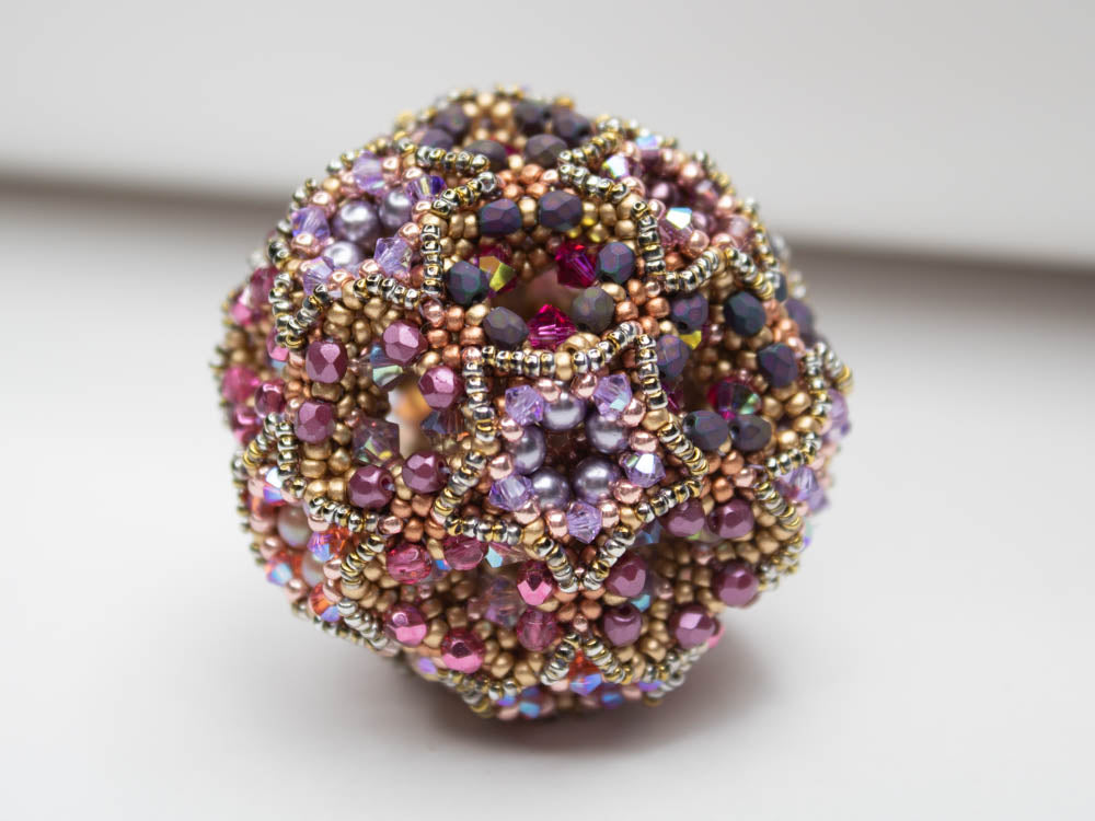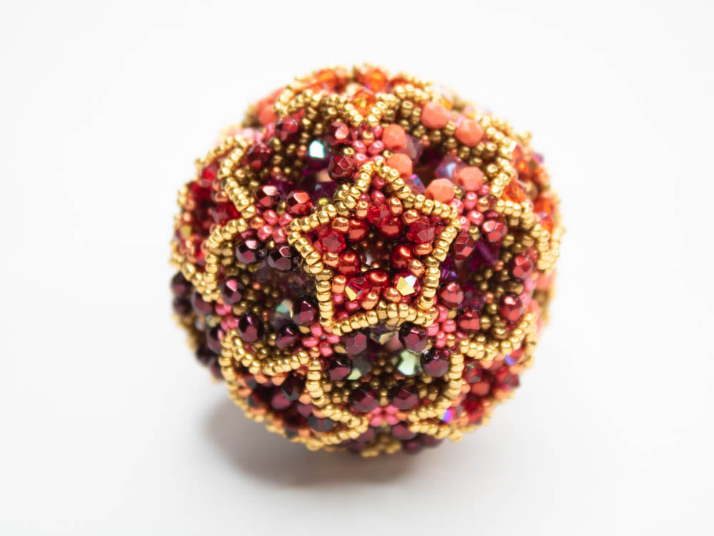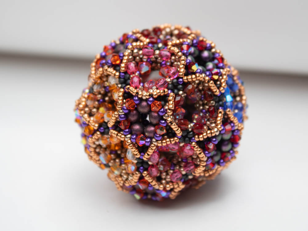This ornament deserves its name. It is perfect symmetry, only interrupted by the gradient color change all over. The sphere is perfectly sturdy and quite robust. It is worked in layers and does not use any complicated 3D stitches. It has a diameter of 5cm.