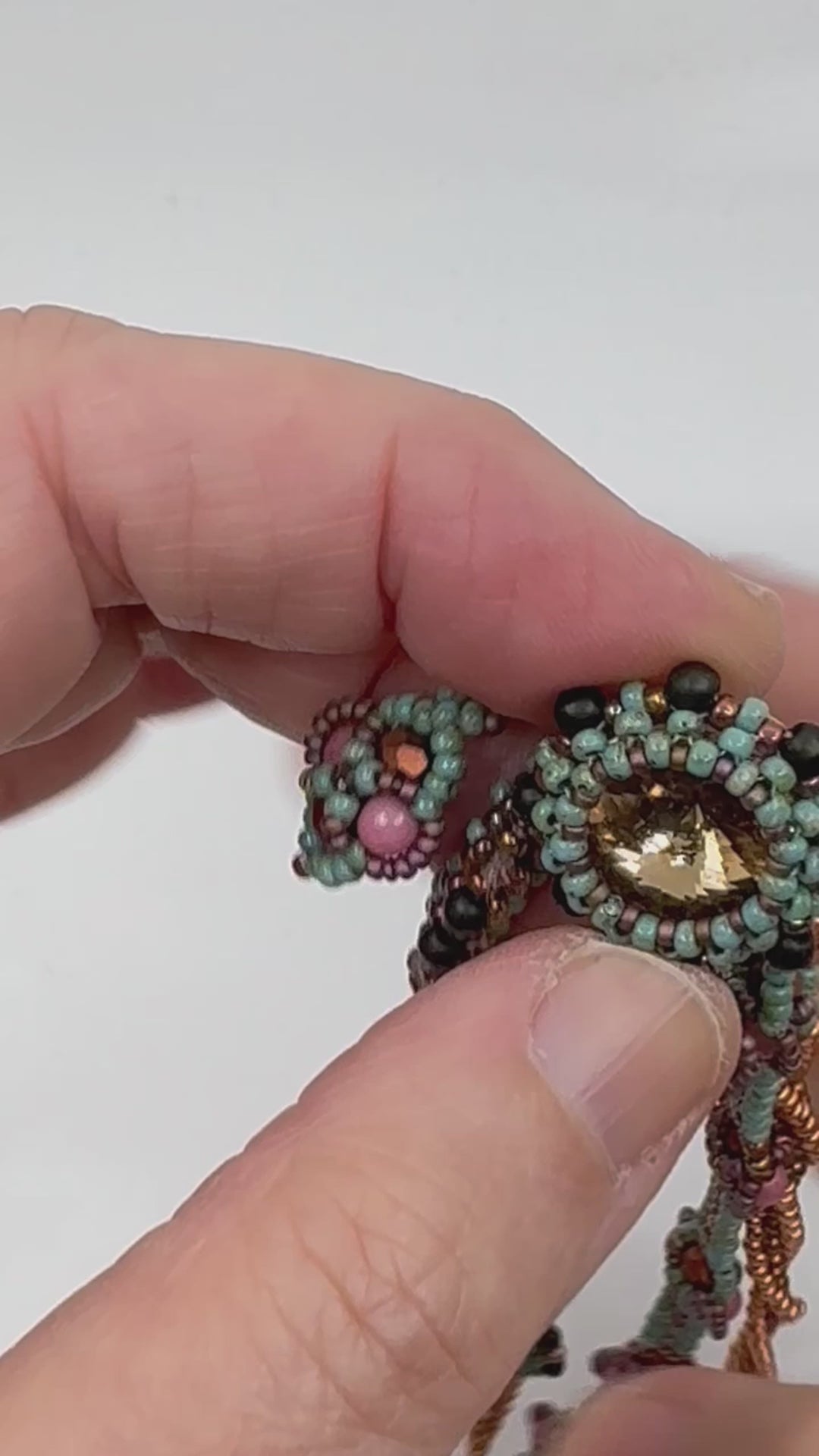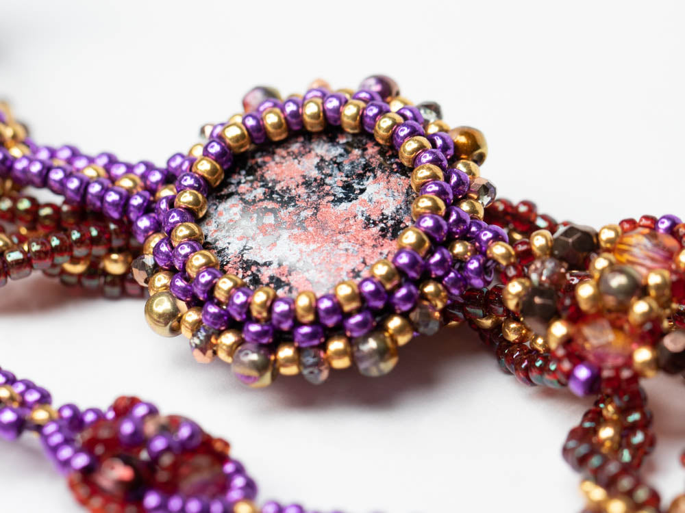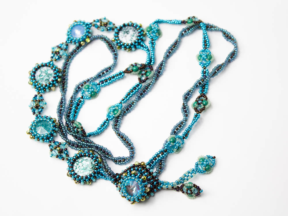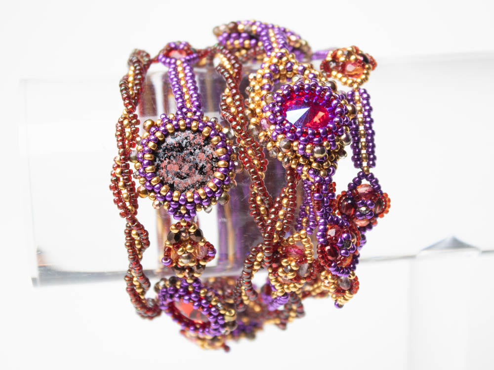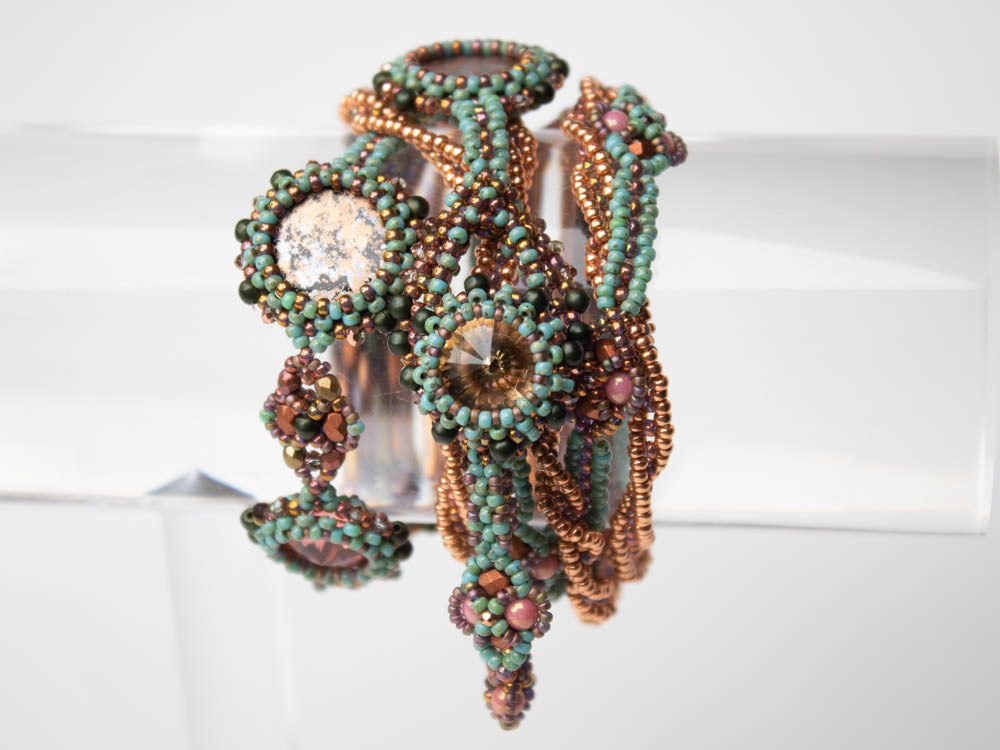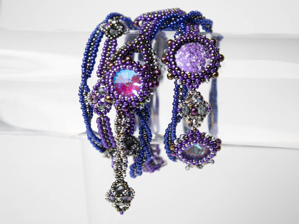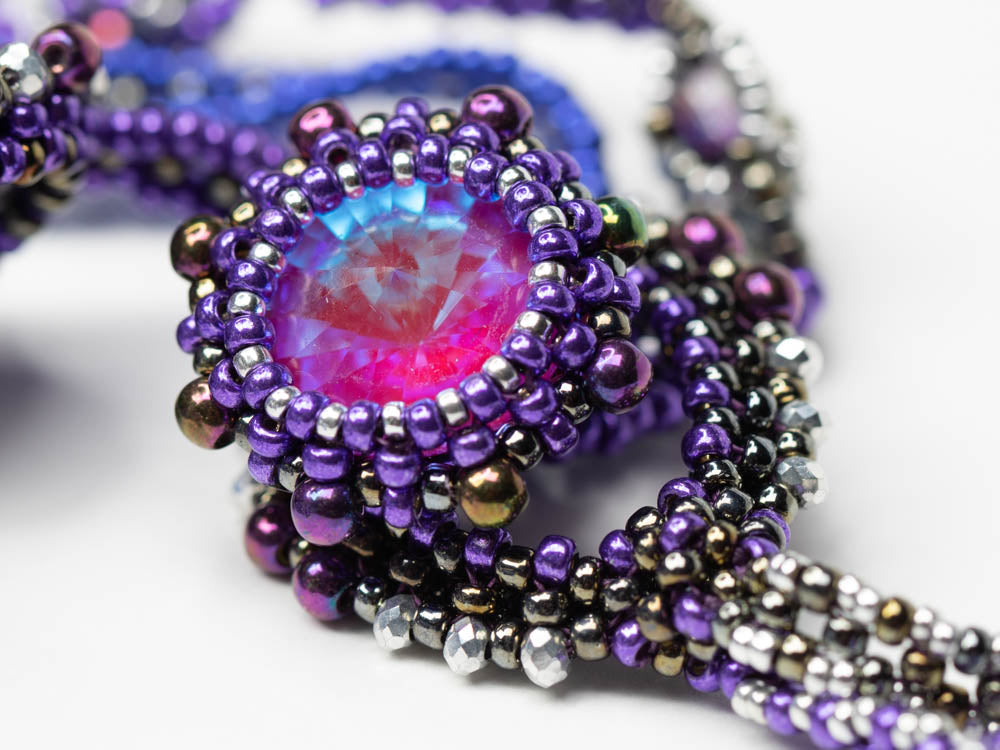 Required Supplies: Cabochons extra low 18mm (or Rivoli), Rivoli 14mm, firepolished beads 3 and 4mm, round beads 3 and 4mm, Rondelles (1.5 - 2mm), seed beads size 11 and 15.