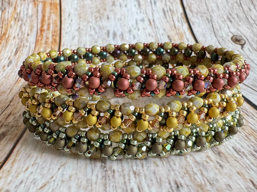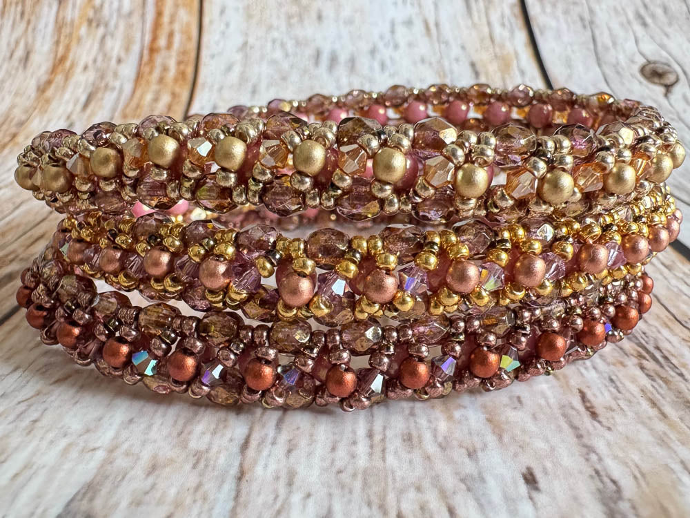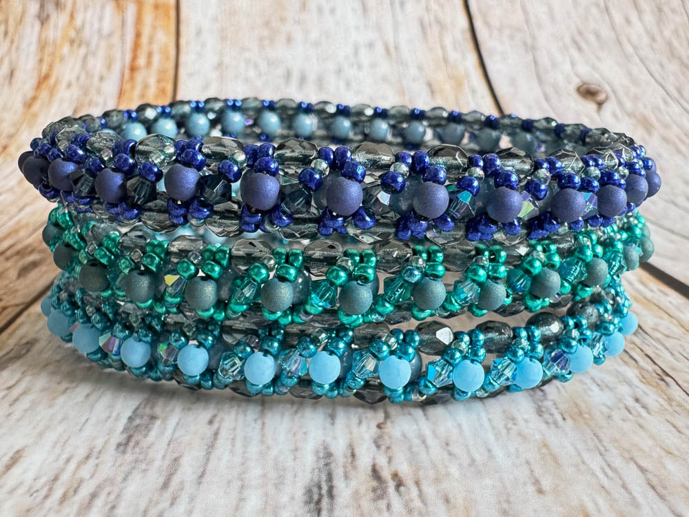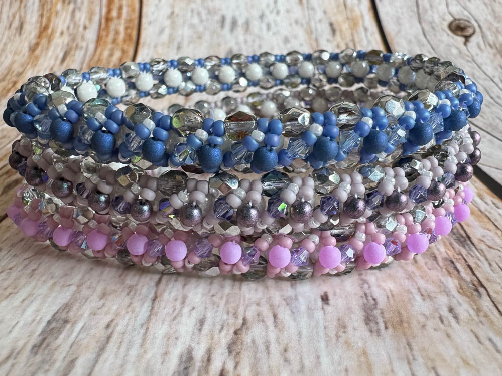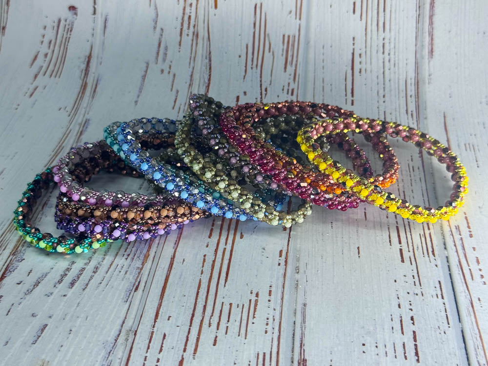 The matching kits for the pattern. The kits include enough beads for one set of three bangles (at least 23cm) as shown in the picture. Needles and thread are not included.