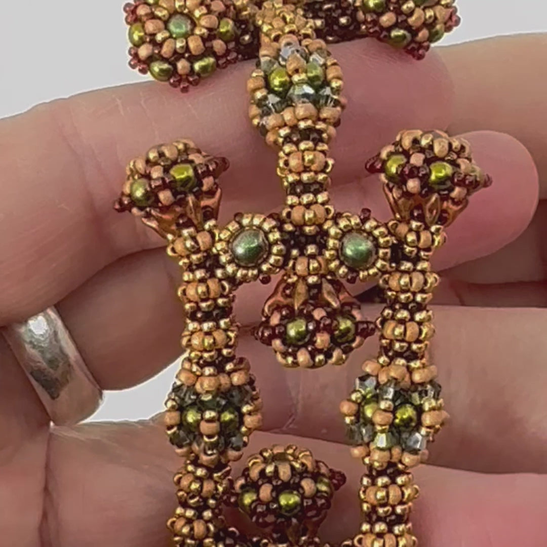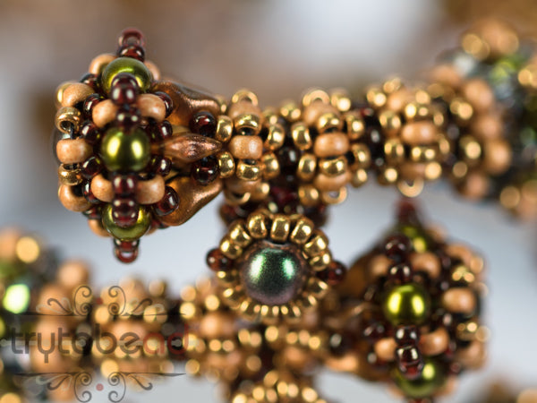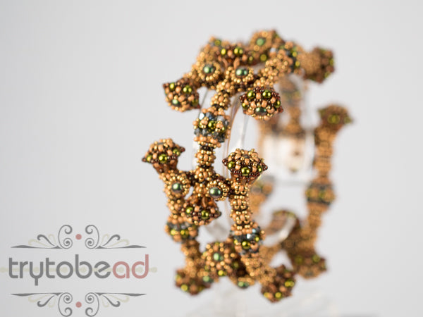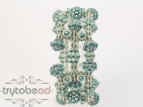 Required supplies: Round beads 3 and 4mm, Bicones 3mm, Super8 beads (TM), seed beads size 11 and 15.