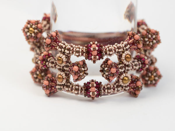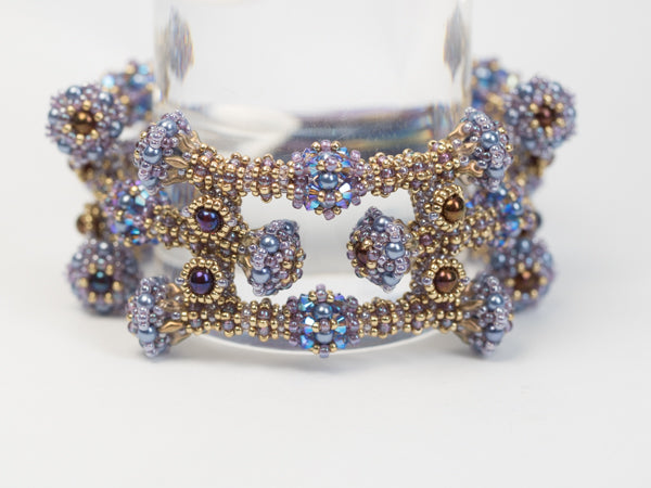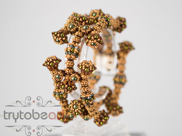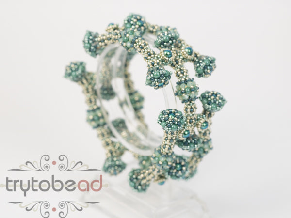 I created this bangle after a piece of jewelry I saw at Villa Giulia in Rome. The parts of the tubes are connected sidewise which creates a closed ring around your wrist. The pattern shows how to change the length of the piece easily.
