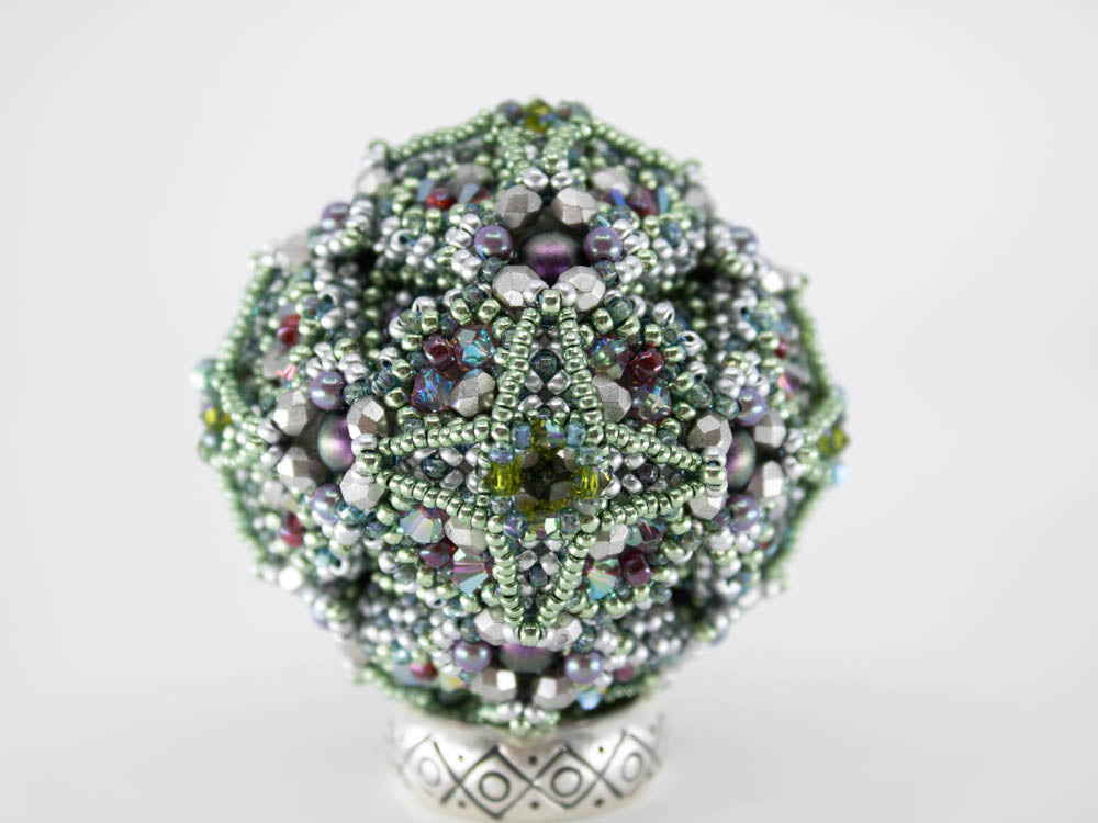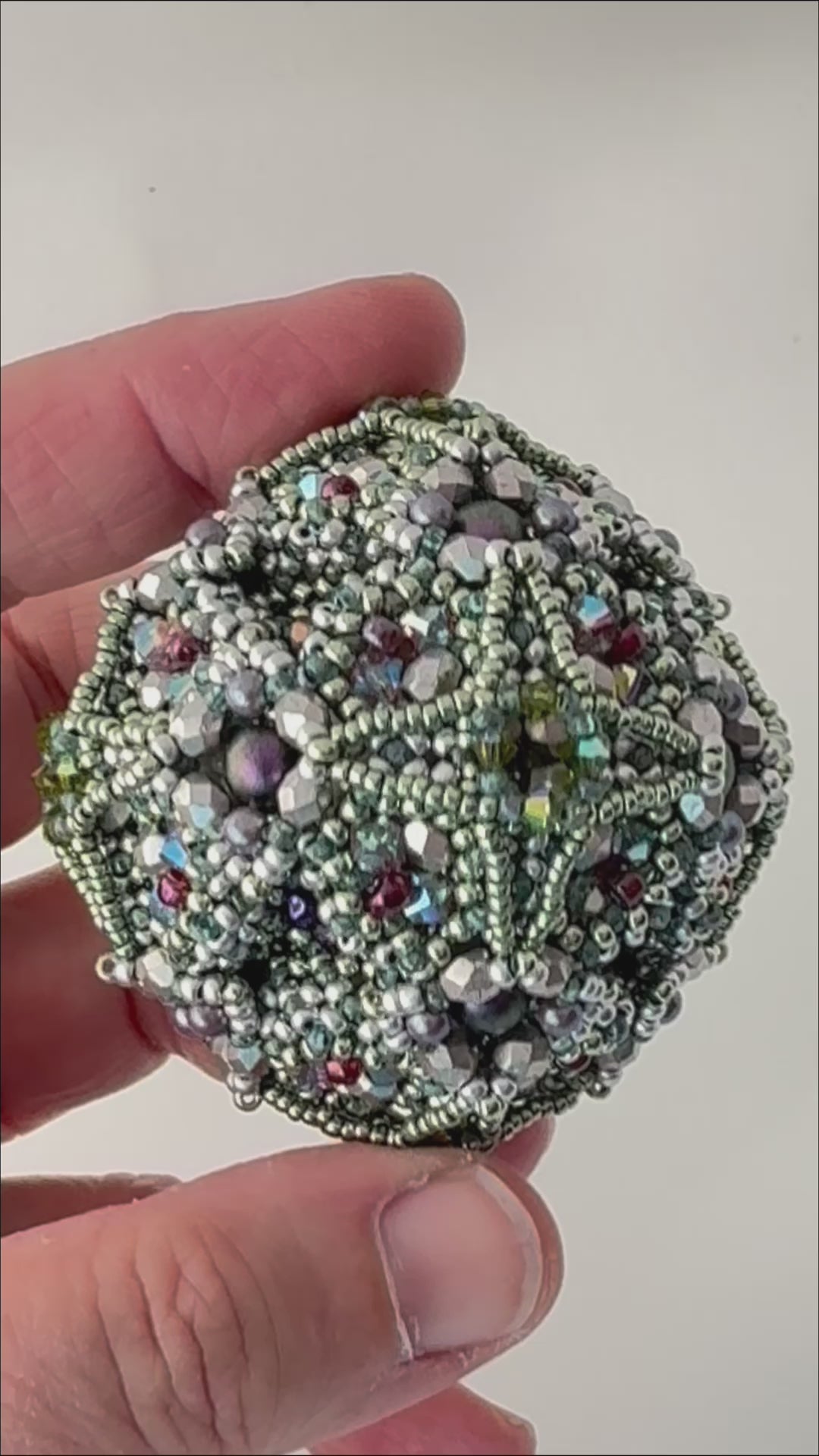 What looks like a ball, is actually a cube. Six sides of pure sparkle and other embellishments make it appear round. The sphere has a diameter of about 6.5cm.
