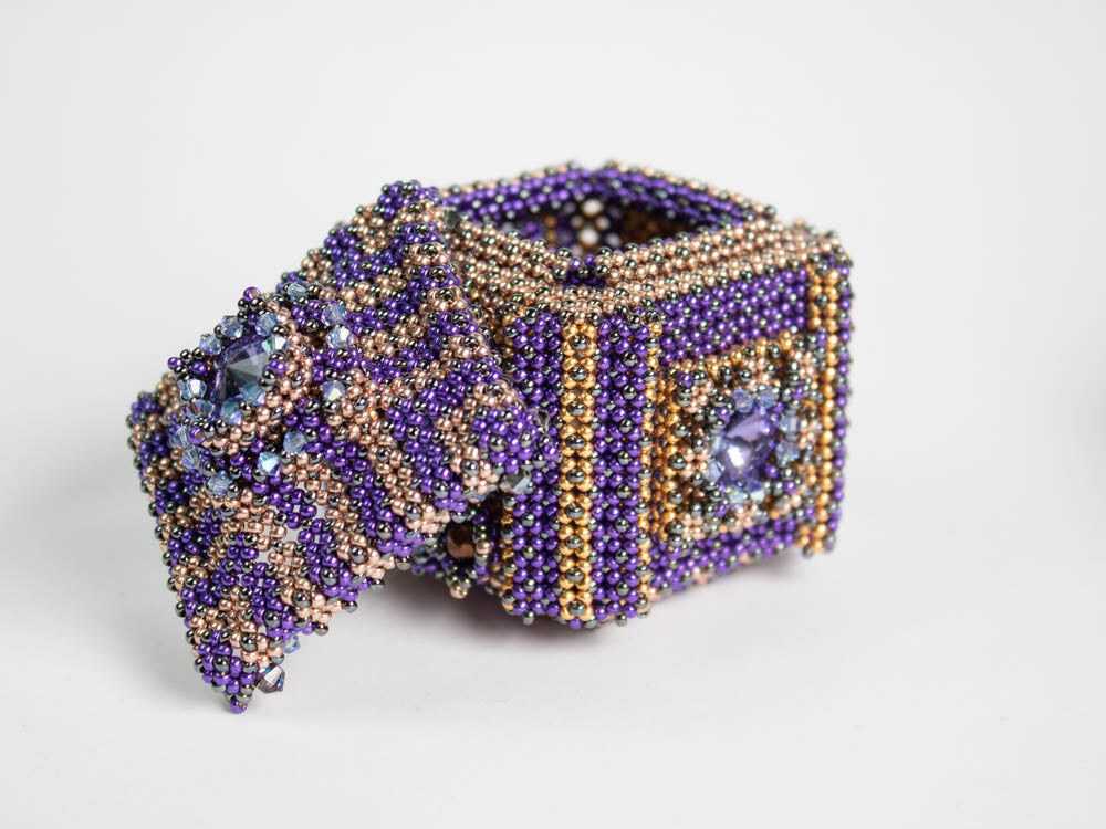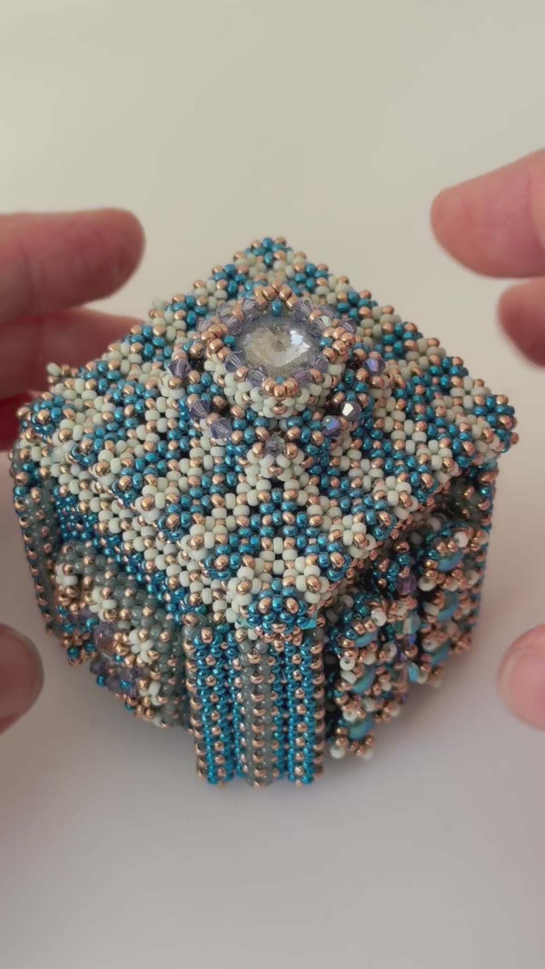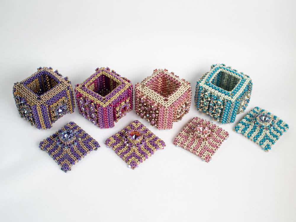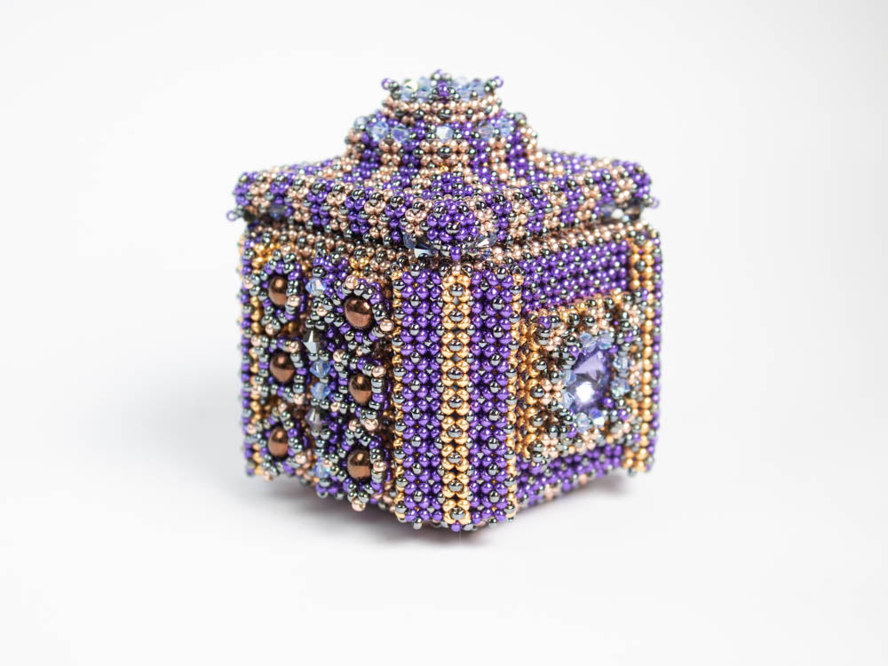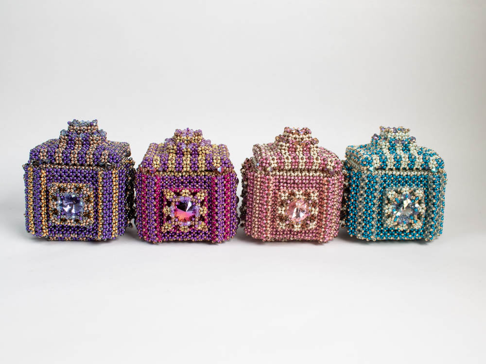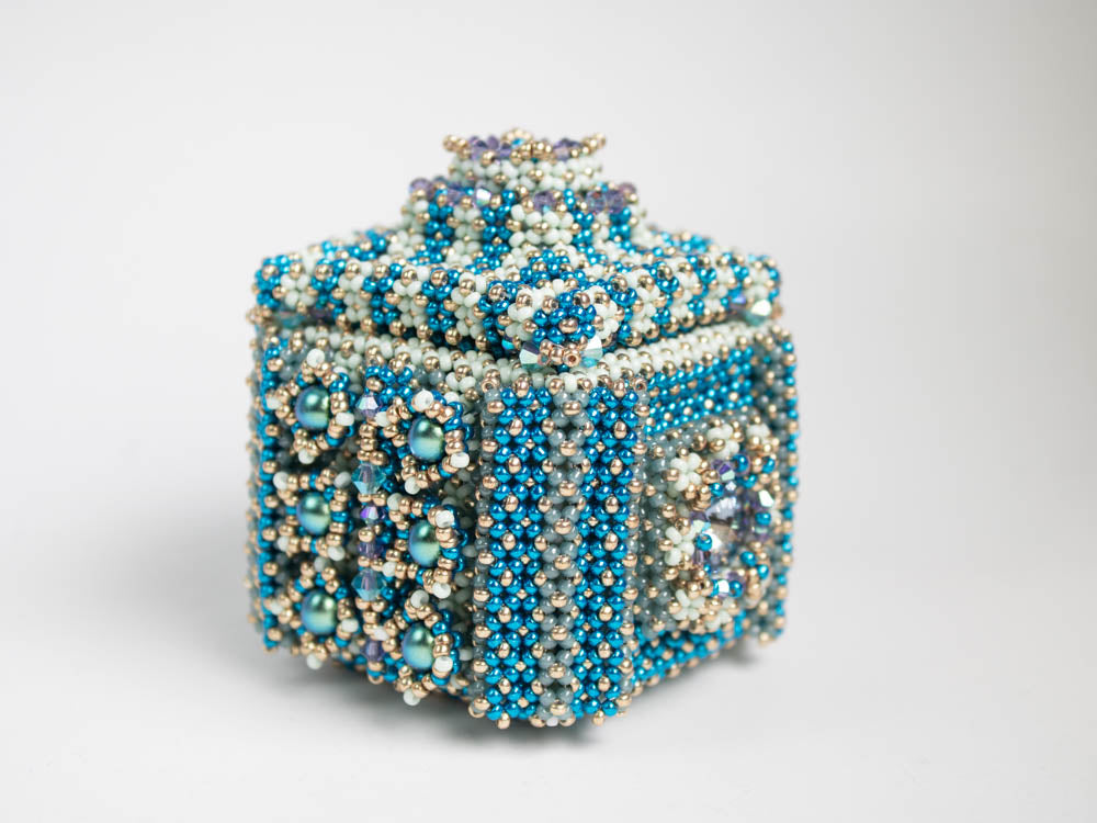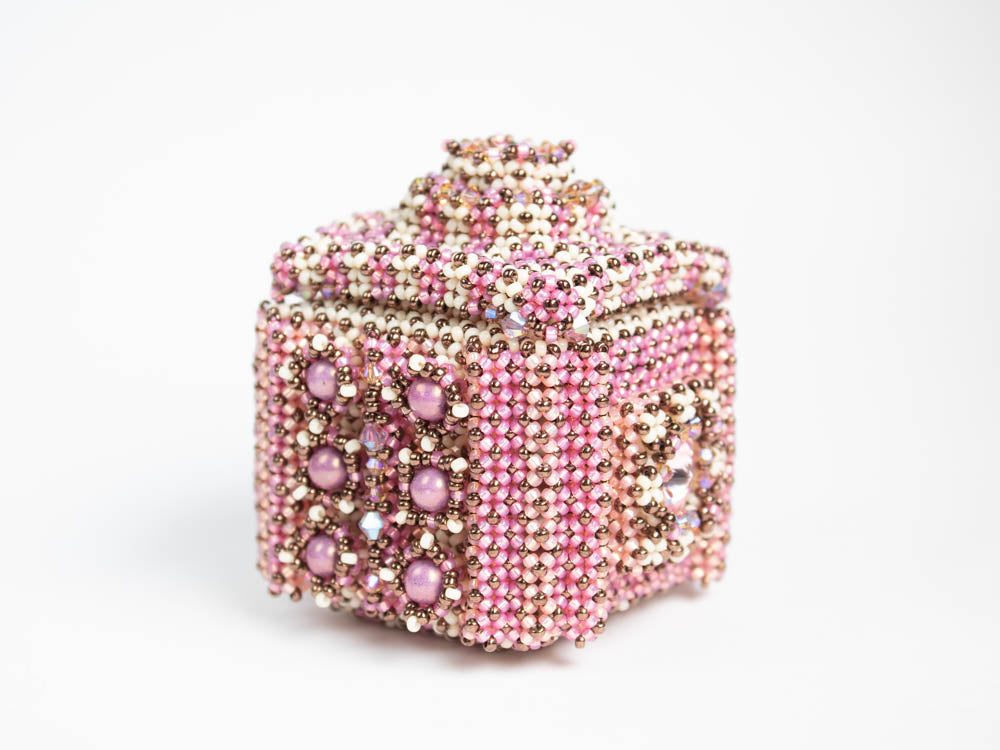 The box has a diameter of about 5.5cm. The lid and two sides are embellished with a bezeled Rivoli. The other sides are decorated with bezeled round beads. Most parts of the box are made in Double right angle weave.