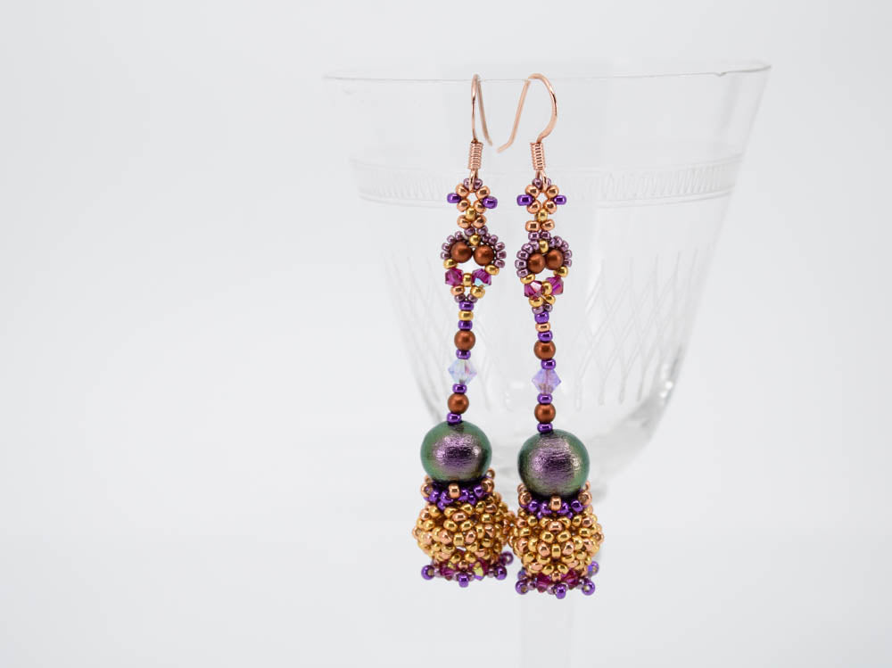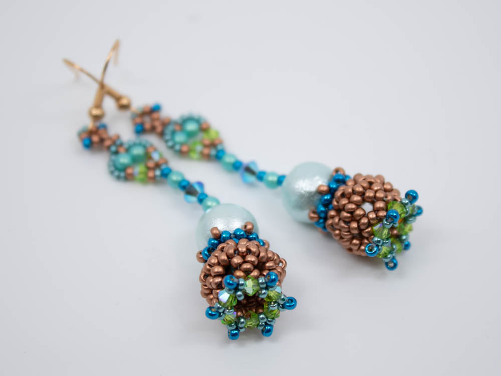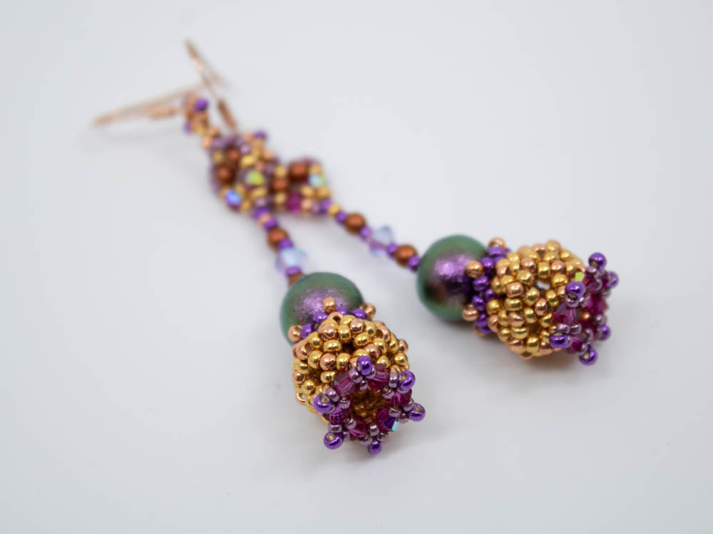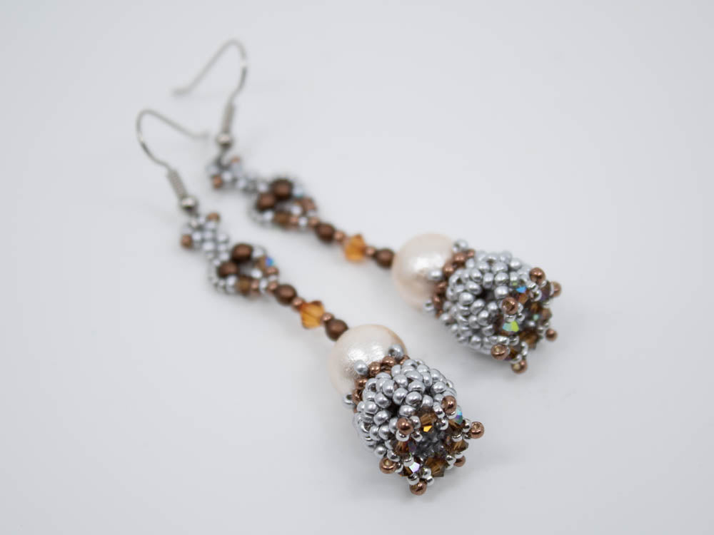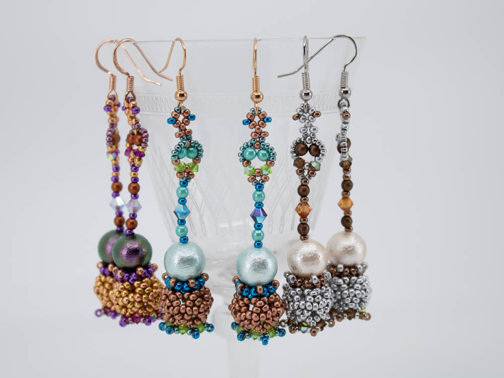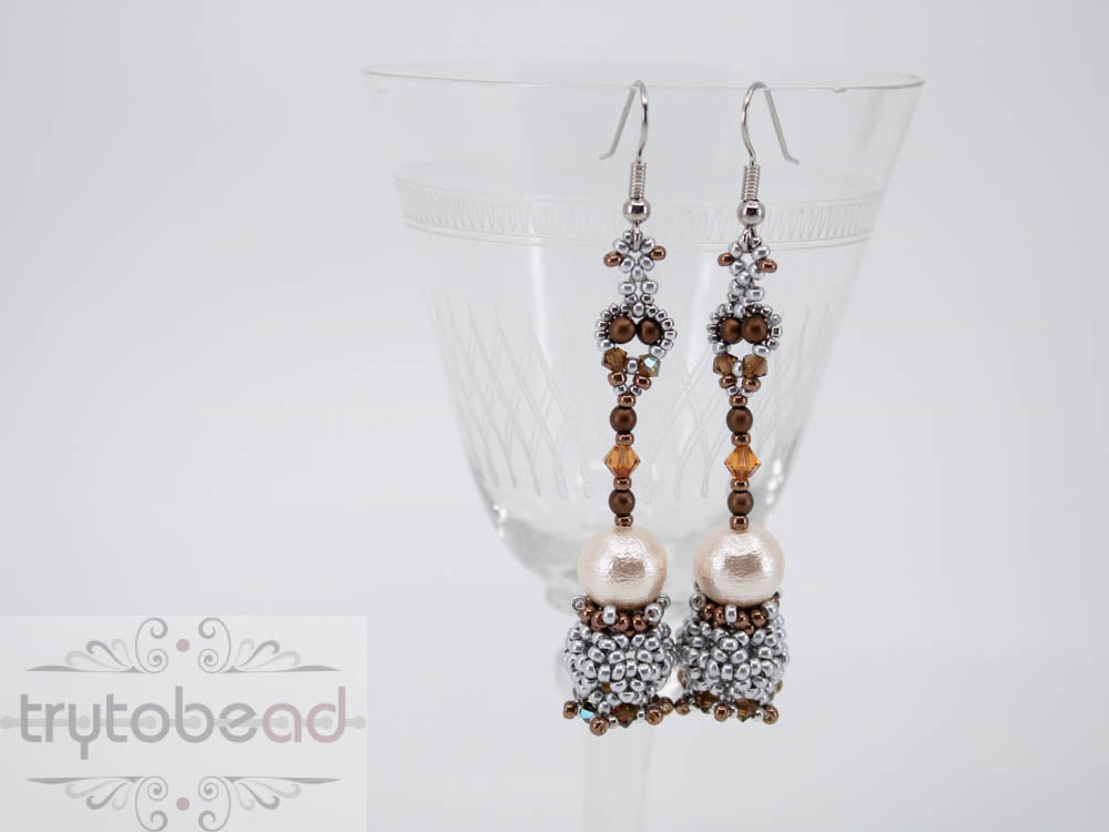 Required supplies: Earwires, round beads 10mm, Bicones 4mm, Bicones 3mm, round beads 3mm, seed beads size 11 and 15.