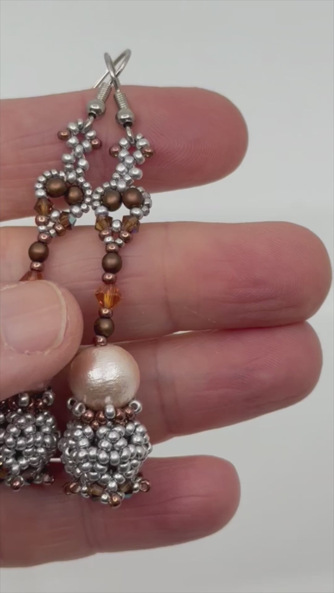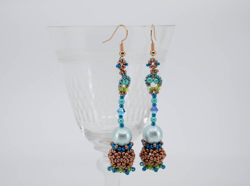 Obviously the lightest wrecking ball in history! The focal is a cotton pearl and these are just perfect for earrings. The weight is only 2.5g! And yet the ball in the bottom position makes them swing gently when you move.